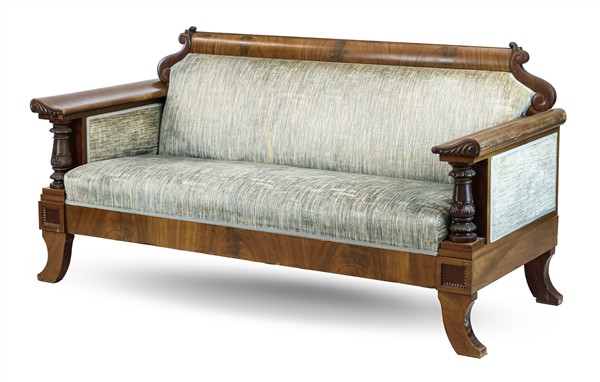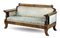 Divano in legni vari con montanti a colonna intagliata e piedi mossi, sedute e schienale imbottiti. Secolo XIX (l cm 176) (difetti)