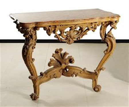 CONSOLLE Consolle in legno laccato a due gambe, piano in legno decorato a finto marmo, epoca XVIII secolo H 89 108x50 Lacquered wooden console with two legs, wooden top decorated with an imitation marble, antique eighteenth century