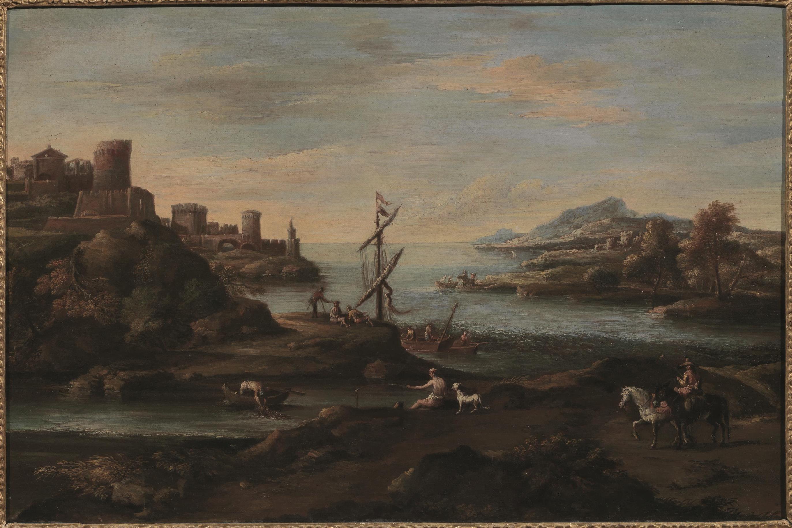 PAESAGGIO COSTIERO CON PESCATORI E CAVALIERE