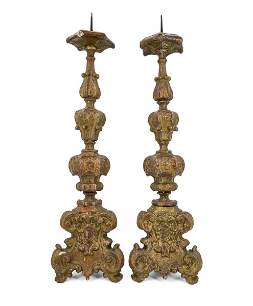 Coppia di candelieri in legno intagliato con fronte dorato e fusto tornito, decoro a volute e piedi terminanti a ricciolo. Secolo XVIII (h cm 75) (difetti e mancanze)