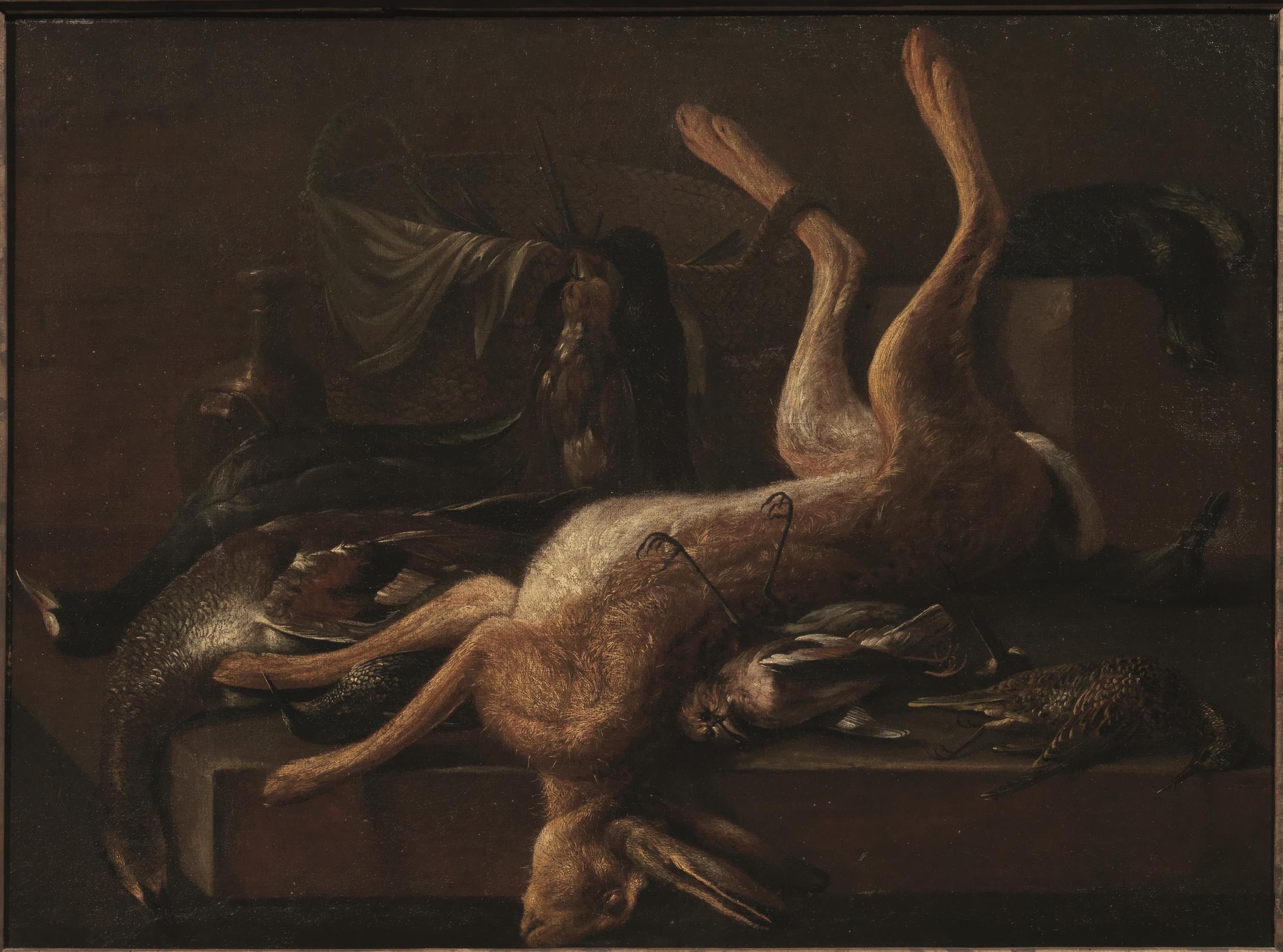 Scuola emiliana, fine sec. XVII SELVAGGINA ADAGIATA SU UN TAVOLO E CESTA olio...