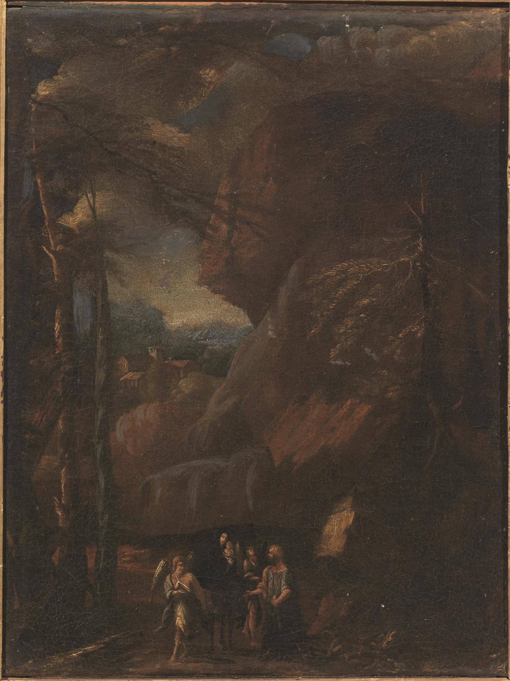 Scuola genovese, sec. XVII LA FUGA IN EGITTO olio su tela, cm 45,5x35 sul...