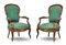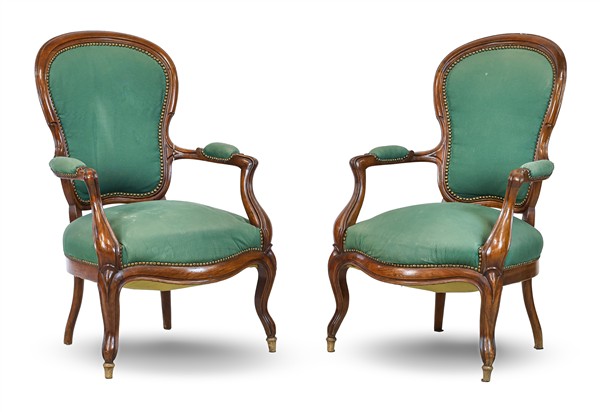 Coppia di poltrone di forma sagomata in noce intagliato con seduta, schienale e braccioli in tessuto verde borchiato (difetti)