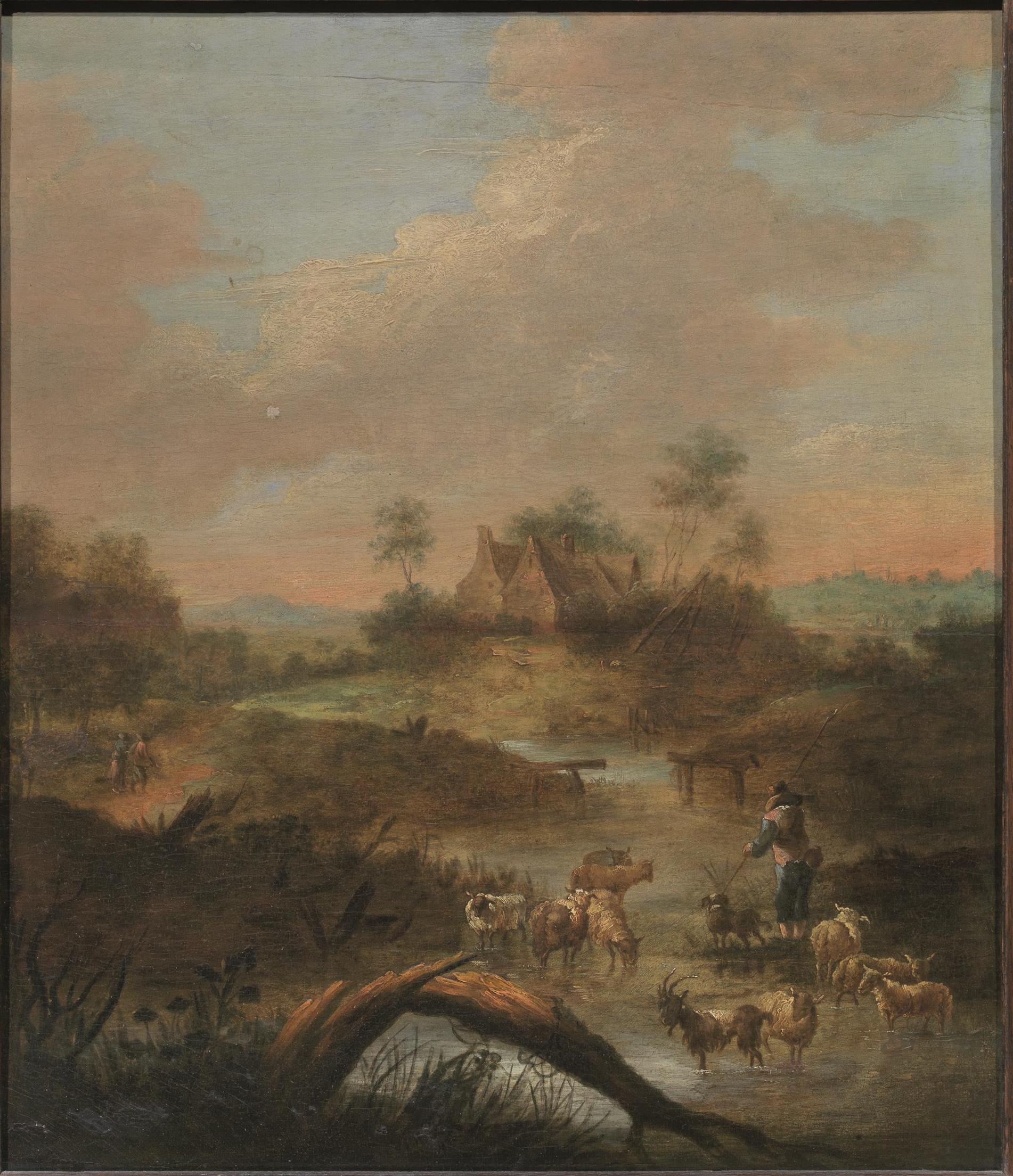 PAESAGGIO CON PASTORE E ARMENTI PRESSO UN CORSO D'ACQUA