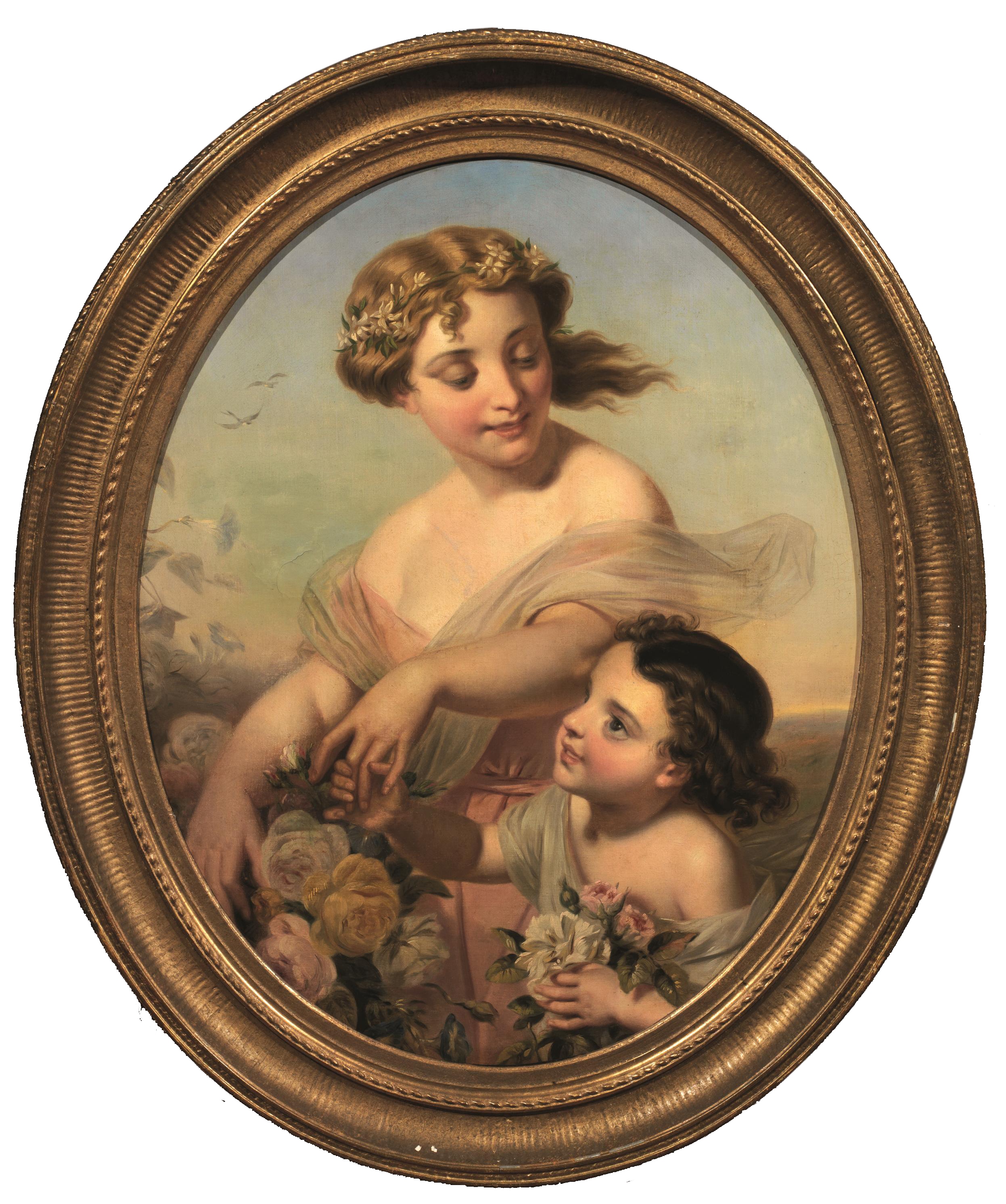 Lot 134 | Scuola del sec. XIXFIGURA FEMMINILE CON BAMBINA olio su tela ovale, cm 81x66