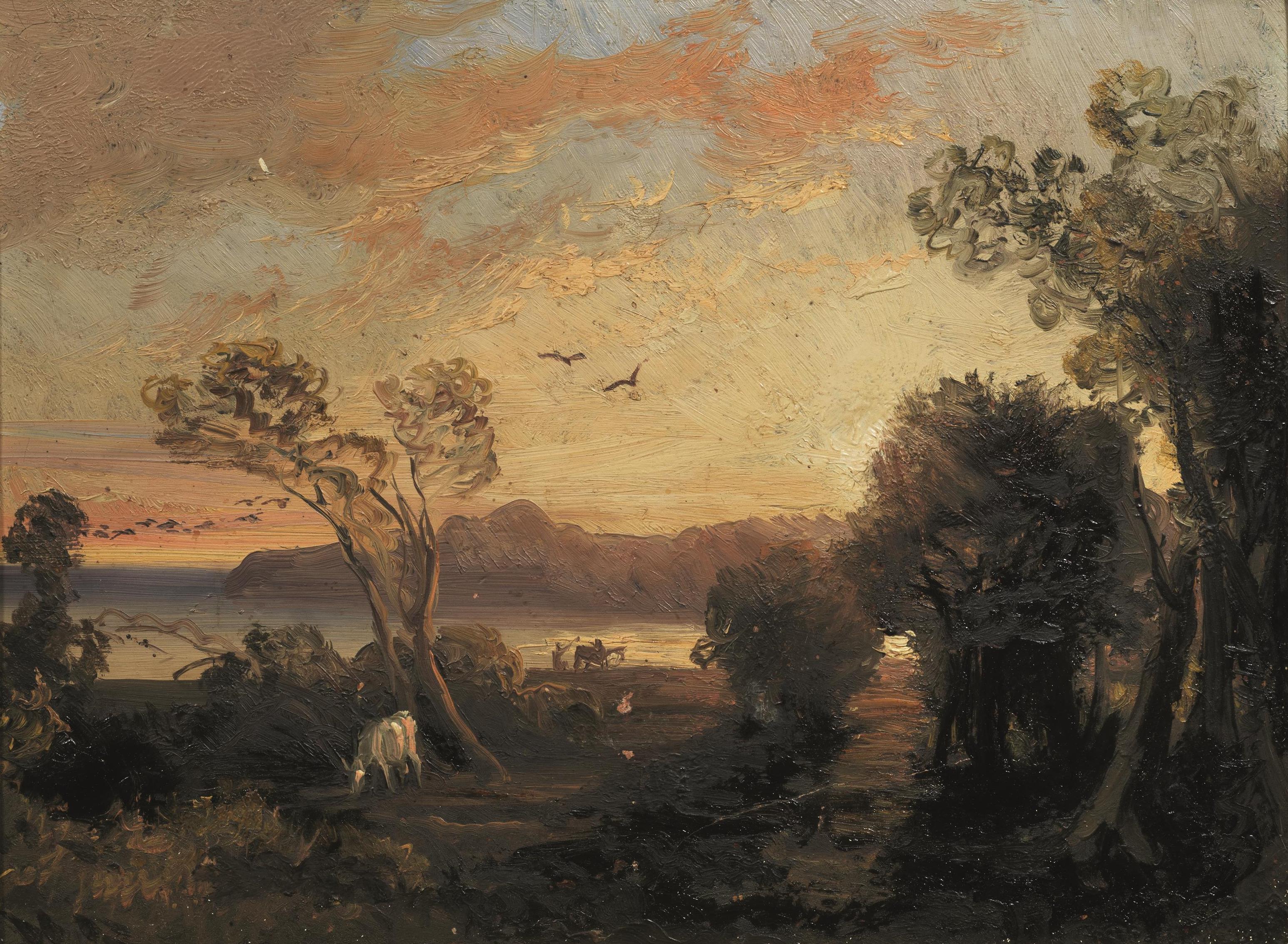 Scuola Napoletana del sec. XIX TRAMONTO olio su ardesia, cm 20x27