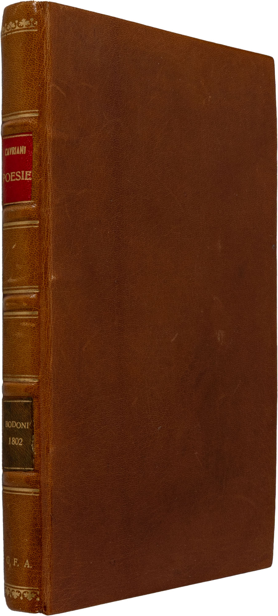 Cavriani Federico - Opere varieParma, Co' tipi bodoniani, 1832Legatura in piena pelle con titoli in oro al dorso; medaglia incisa in rame al frontespizioPag. VIII, (2), 134In 8° grandeRaccolta di poesie del nobiluomo mantovanoCondizioni generali molto buone, splendido e freschissimo esemplare