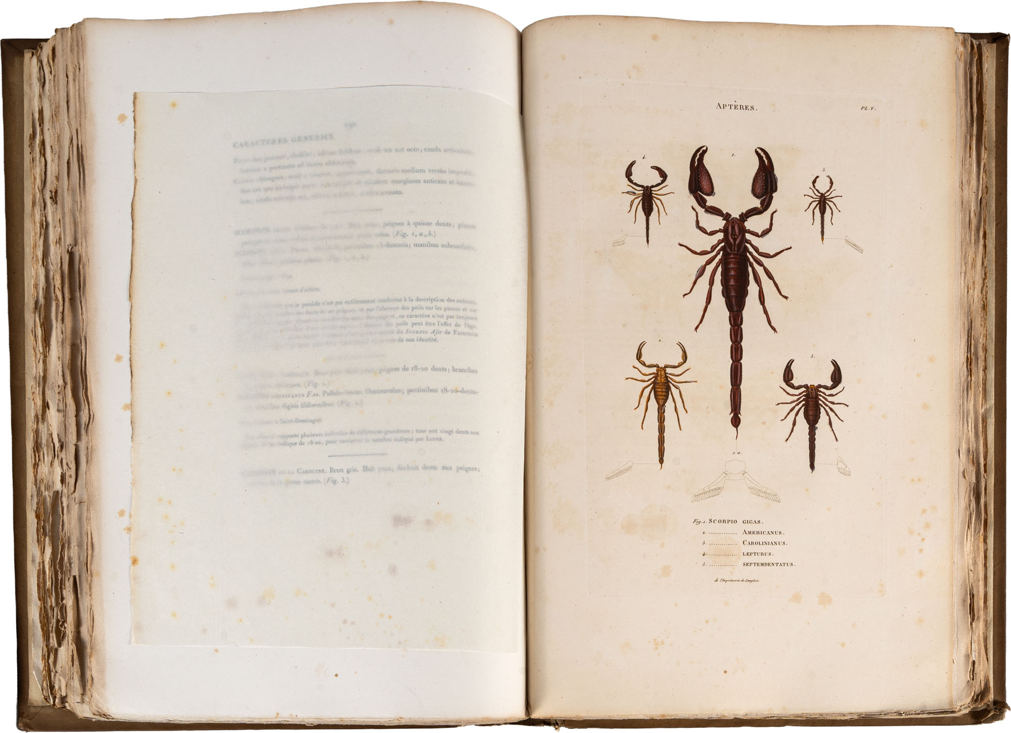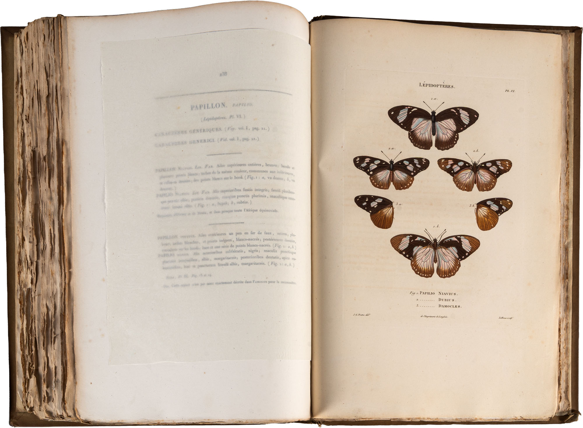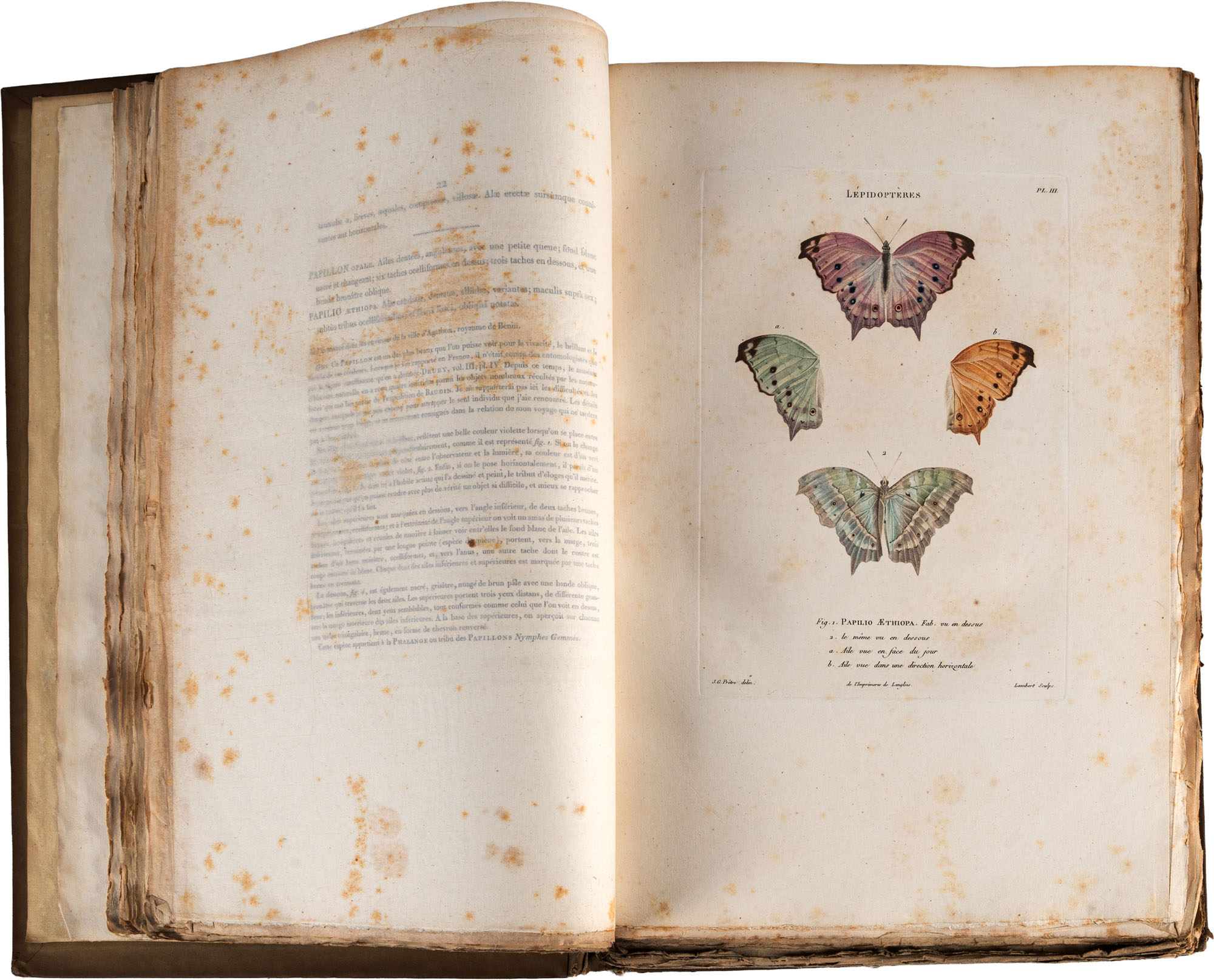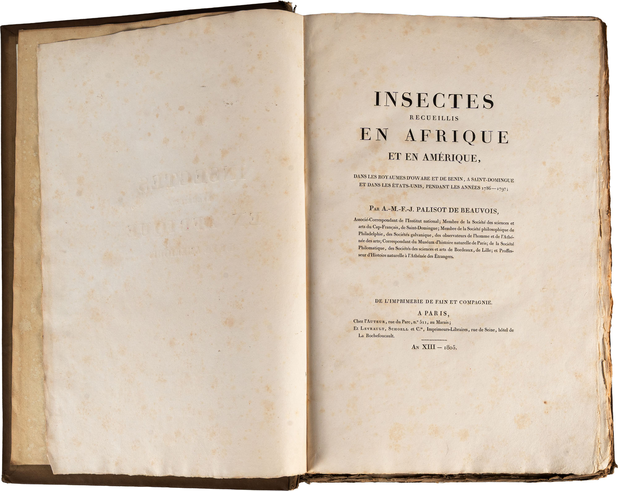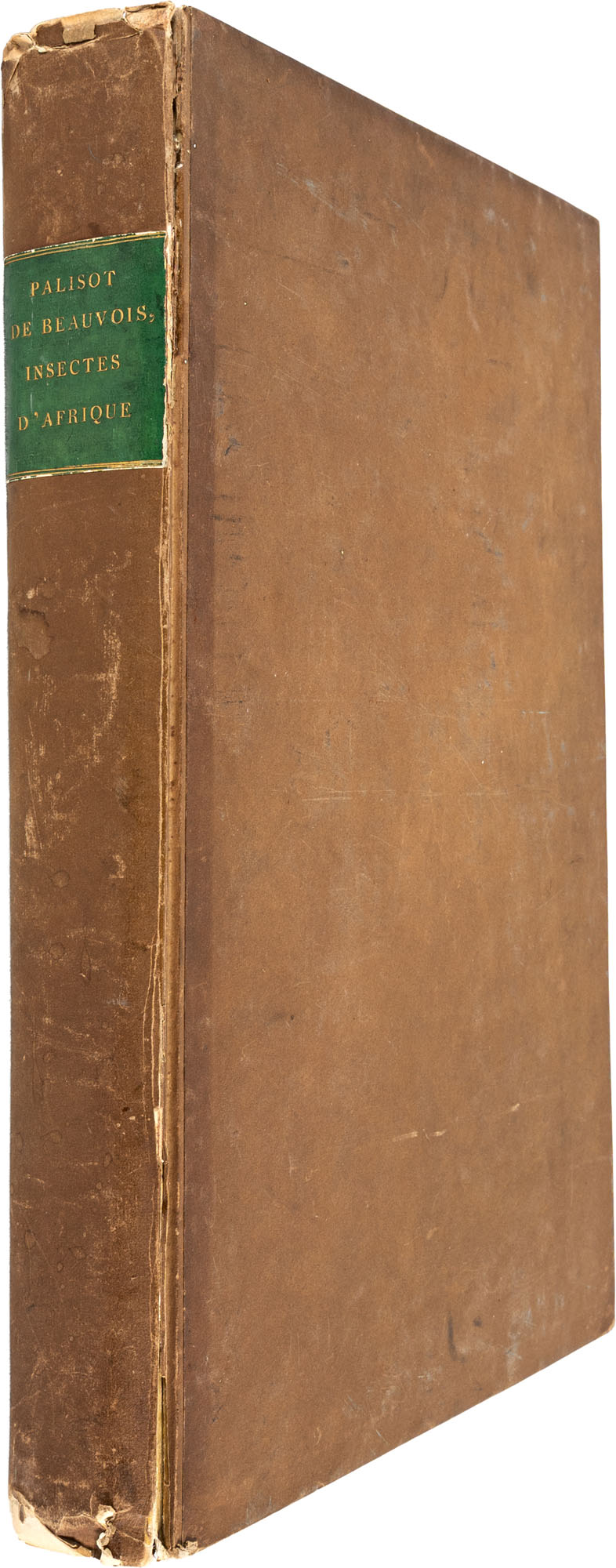 Palisot de Beauvois - Insectes recueillis en Afrique et en Amerique, dans les royaumes d'Oware et de Benin, a' Saint-Domingue et dans les Etats-Unis, pendant les annees 1786 - 1797Paris, chez l'Auteur et Levrault, 1805Pp. (4), XVI, 276, con 90 tavole incise a colori con delicata finitura a mano, incise da J.G. Pretre e stampate da LangloisIn folio (460 x 305 mm)Prima edizione di questa rara e magnifica opera in barbe. La prima iconografia entomologica sugli insetti africani e un importante contributo alla prima entomologia americanaPalisot de Beauvois (1752-1820) fu un naturalista e viaggiatore franceseMacchie di ruggine diffuse e difetti al dorso, non pregiudicano la qualità di quest'opera molto raraComplessivamente esemplare in buone condizioni