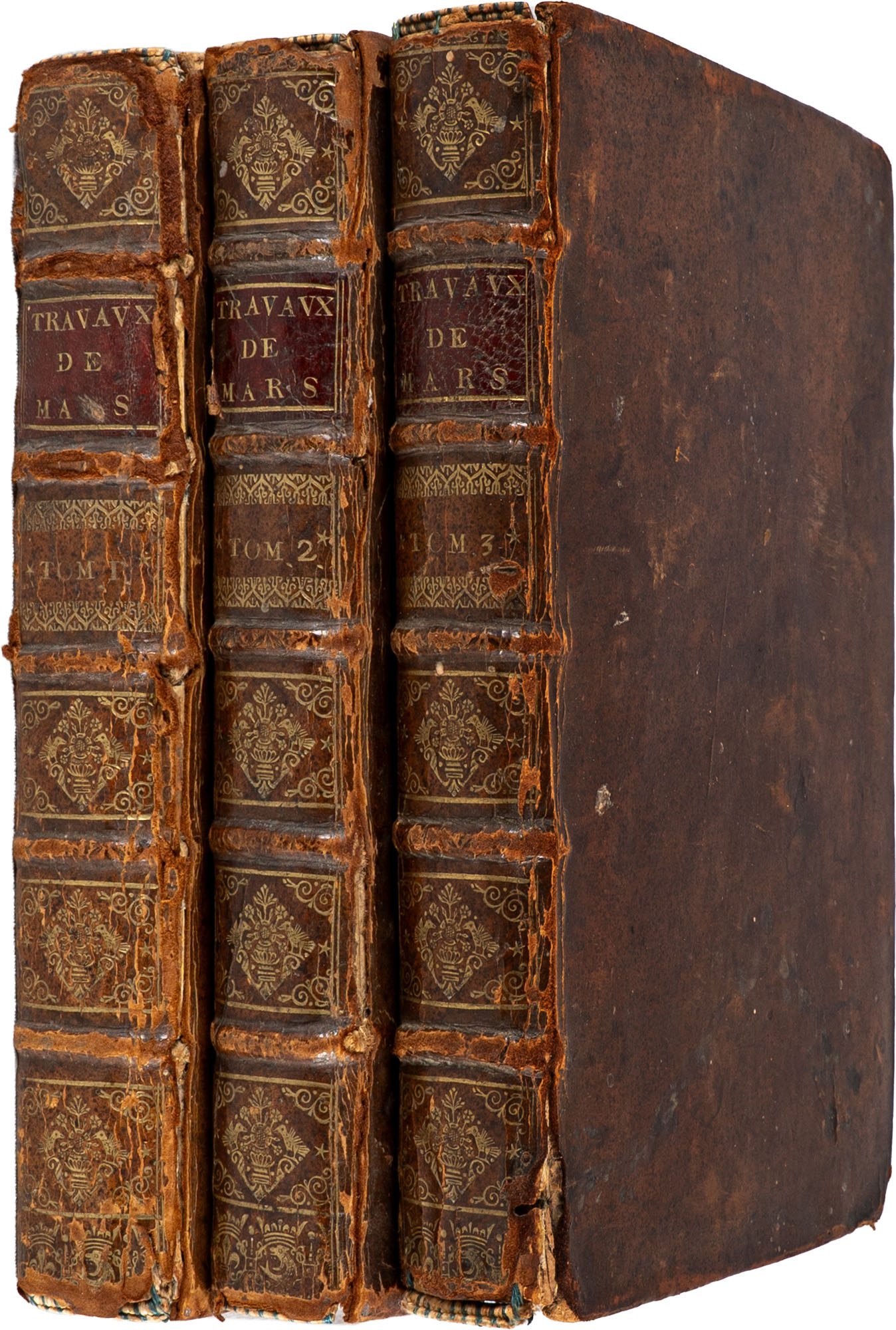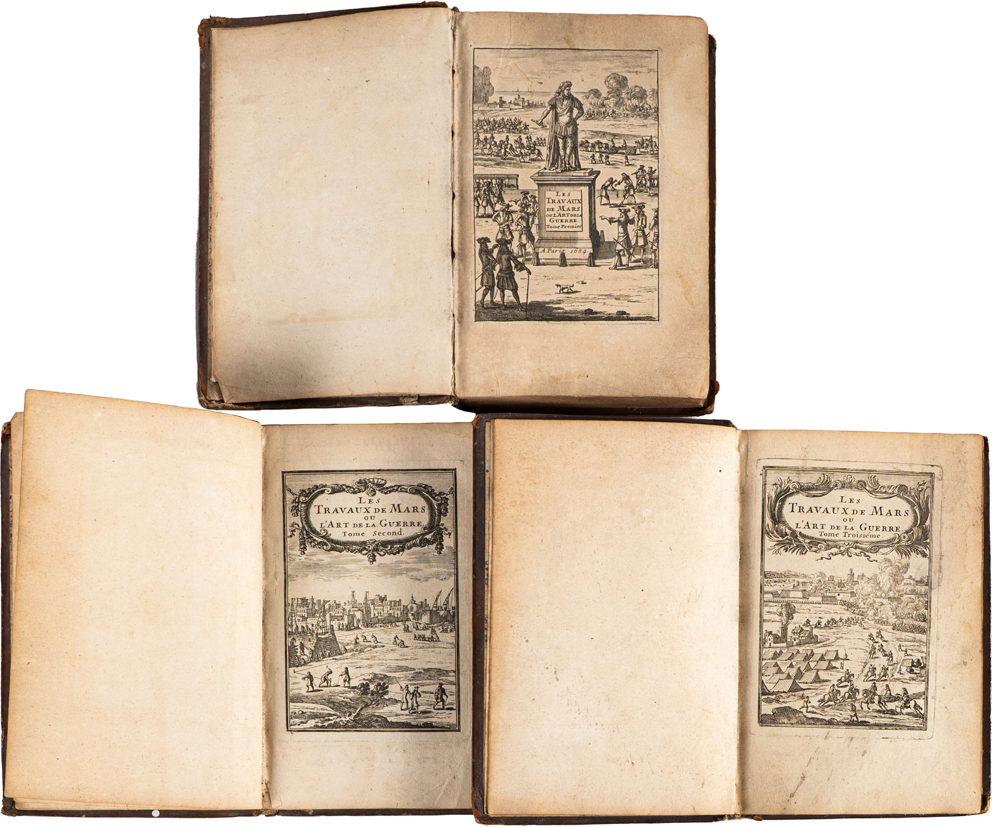 Allain Manesson Mallet - Les traveaux de Mars, ou l'art de la guerre divise' en trois parties... lettera dedicatoria al reParis, Denys Thierry, 1685-16843 volumiLegatura in piena pelle, al dorso decori e titoli in oro, tagli rossiOpera arricchita da 411 superbe incisioniIn 4° (cm. 21 x 13,5) pagine (3b) 363+ind.+(2b), (3b.) 387+ind.+(2b), (2b.) 341+ind.+(2b)Condizioni molto buone