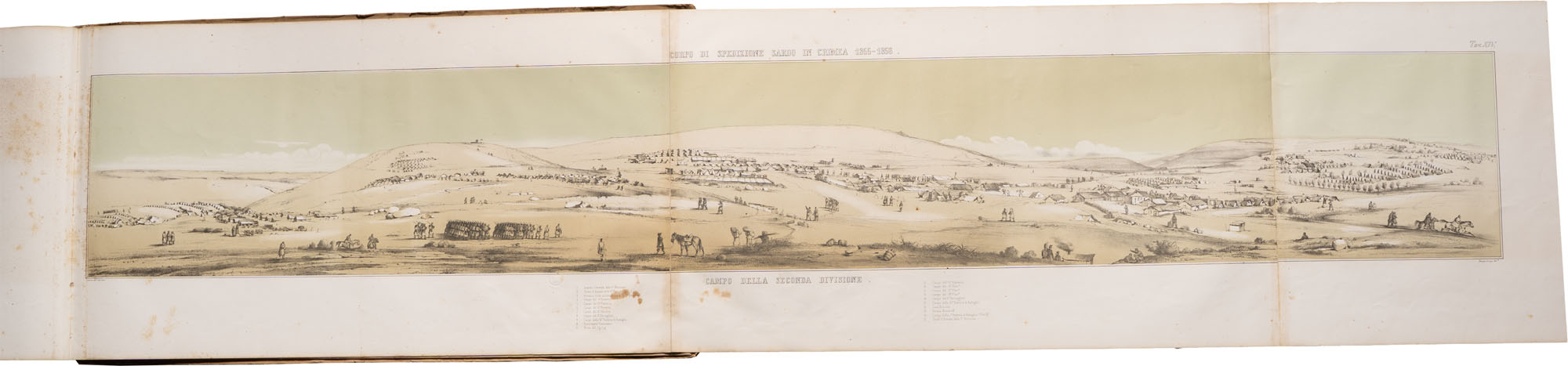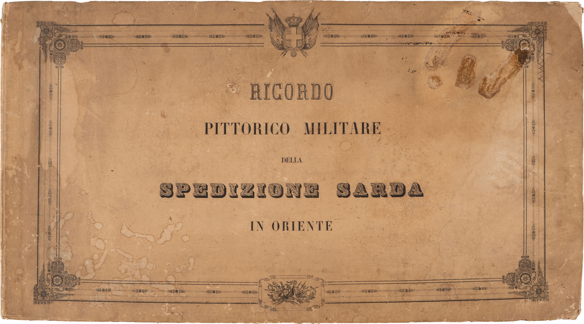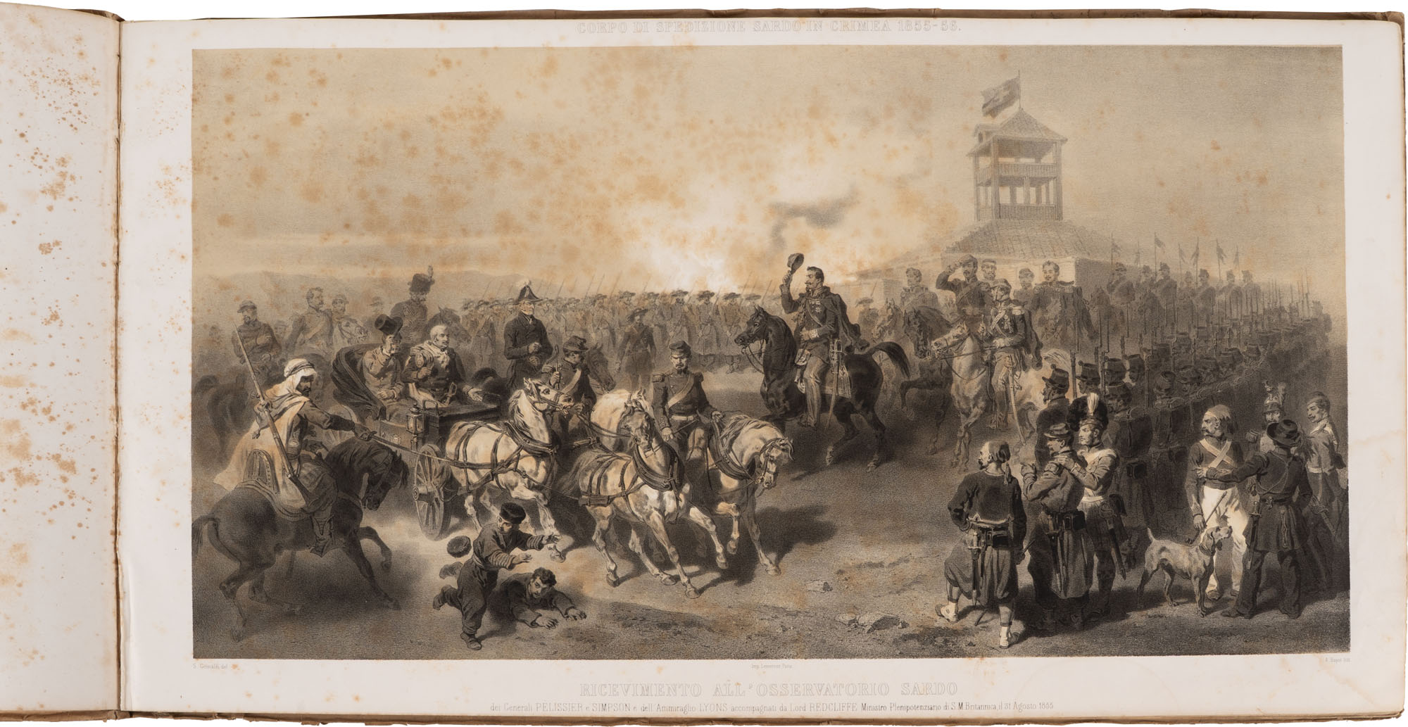 Gerolamo Induno (1825-1890), disegnatore; Luigi Bucco, litografo - Ricordo pittorico militare della Spedizione Sarda in Oriente negli anni 1855-56Pubblicata d'ordine del Ministro di Guerra / per cura del Corpo Reale di Stato MaggioreLegatura originale in cartonePagg. (10) + 24 tavole, alcune ripiegate, in litografia + la tavola del 'Ricevimento all'Osservatorio Sardo'In-folio grande oblungo (mm 420 x 780)Ruggine diffusa e una macchia al piatto anteriore. Buon esemplare, sorprendenti le grandi tavole ripiegate dell'Induno