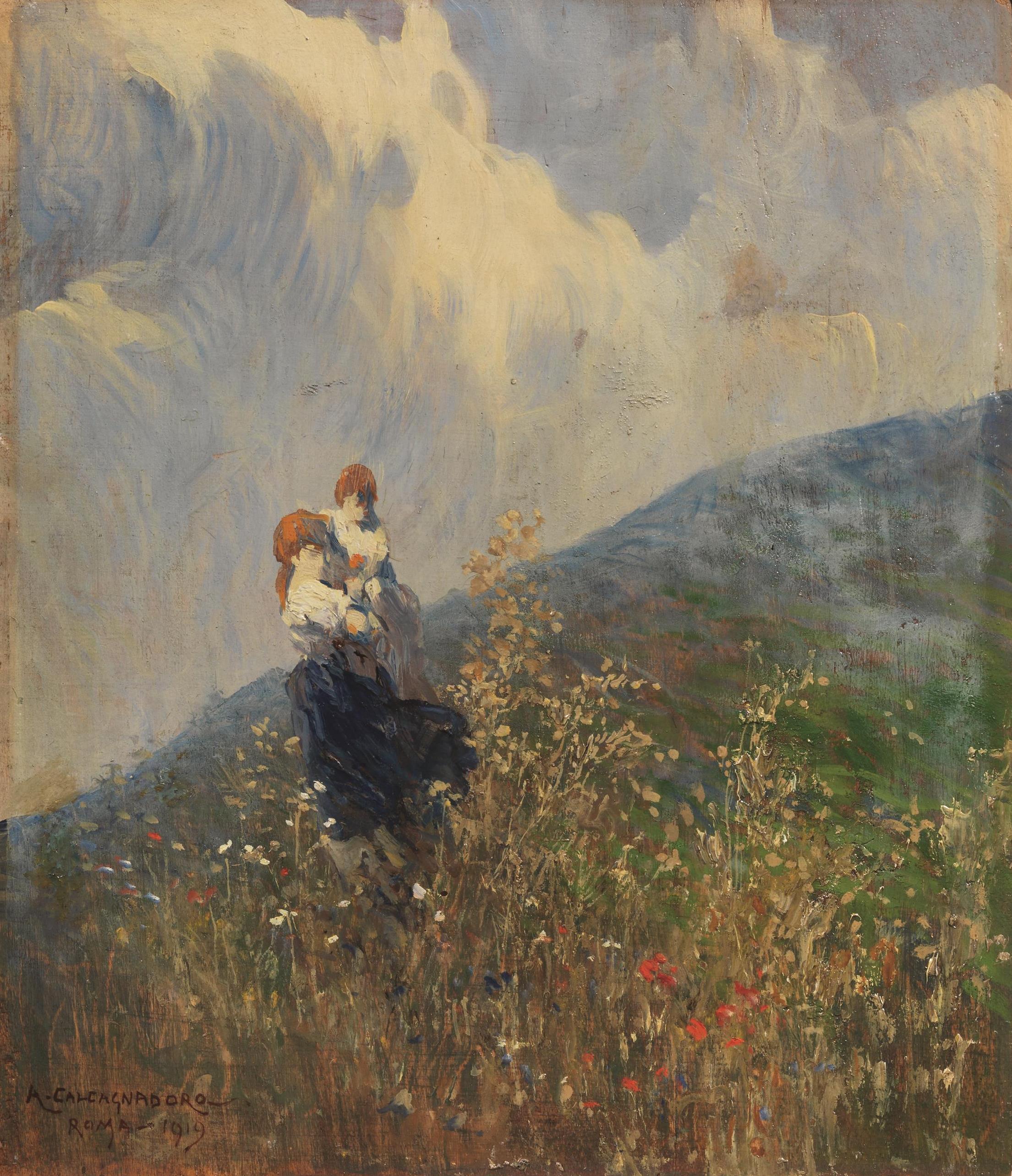 Antonio Calcagnadoro (Rieti 1876 - 1935) DUE FIGURE NEI CAMPI olio su...
