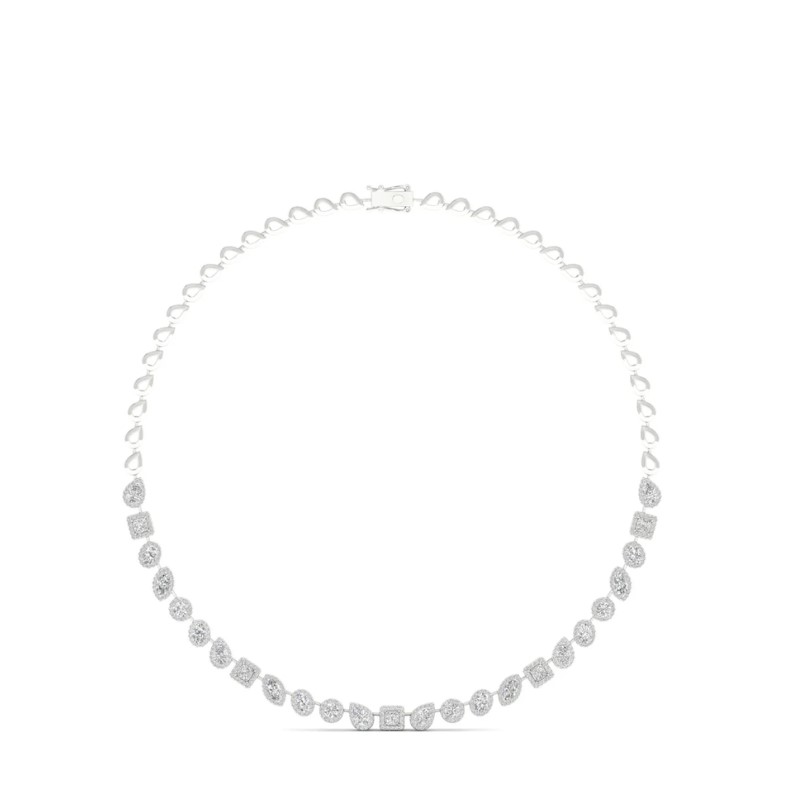 Elegante collana realizzata in oro 14 carati, adornata con diamanti lab-grown di varie forme e tagli. Il design presenta una serie di diamanti rotondi, a goccia e a baguette, disposti lungo tutta la lunghezza per un effetto scintillante e sofisticato.