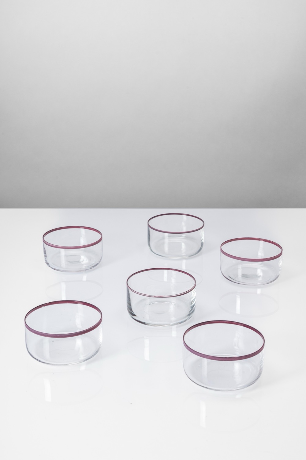 Set di sei coppette in vetro incolore bordate in rosa per Casa PBH, Milano