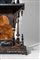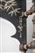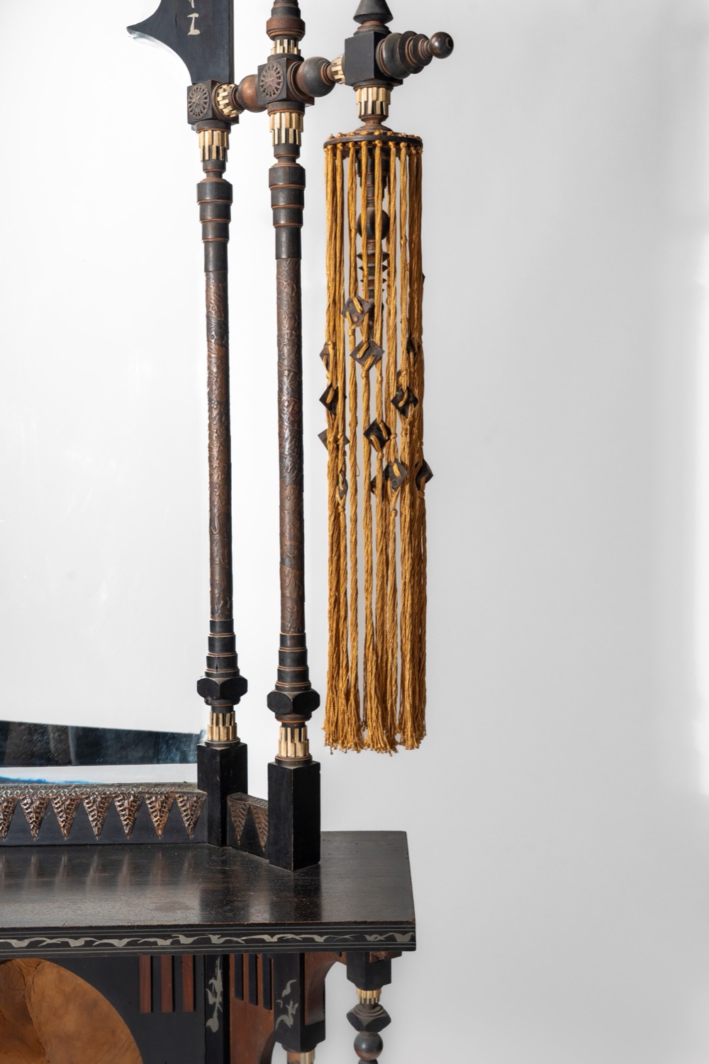 Rara grande console con specchiera, struttura lignea intarsiata in peltro e decorata in osso e rame sbalzato; frange decorative in passamaneria con elementi in rame e rivestimento in pelle