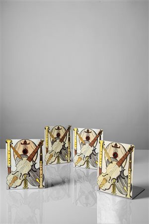 Piero Fornasetti (Milano 10/11/1913 - Milano 09/10/1988) - Set di quattro fermalibri, decoro 'strumenti musicali', 1960 circa