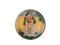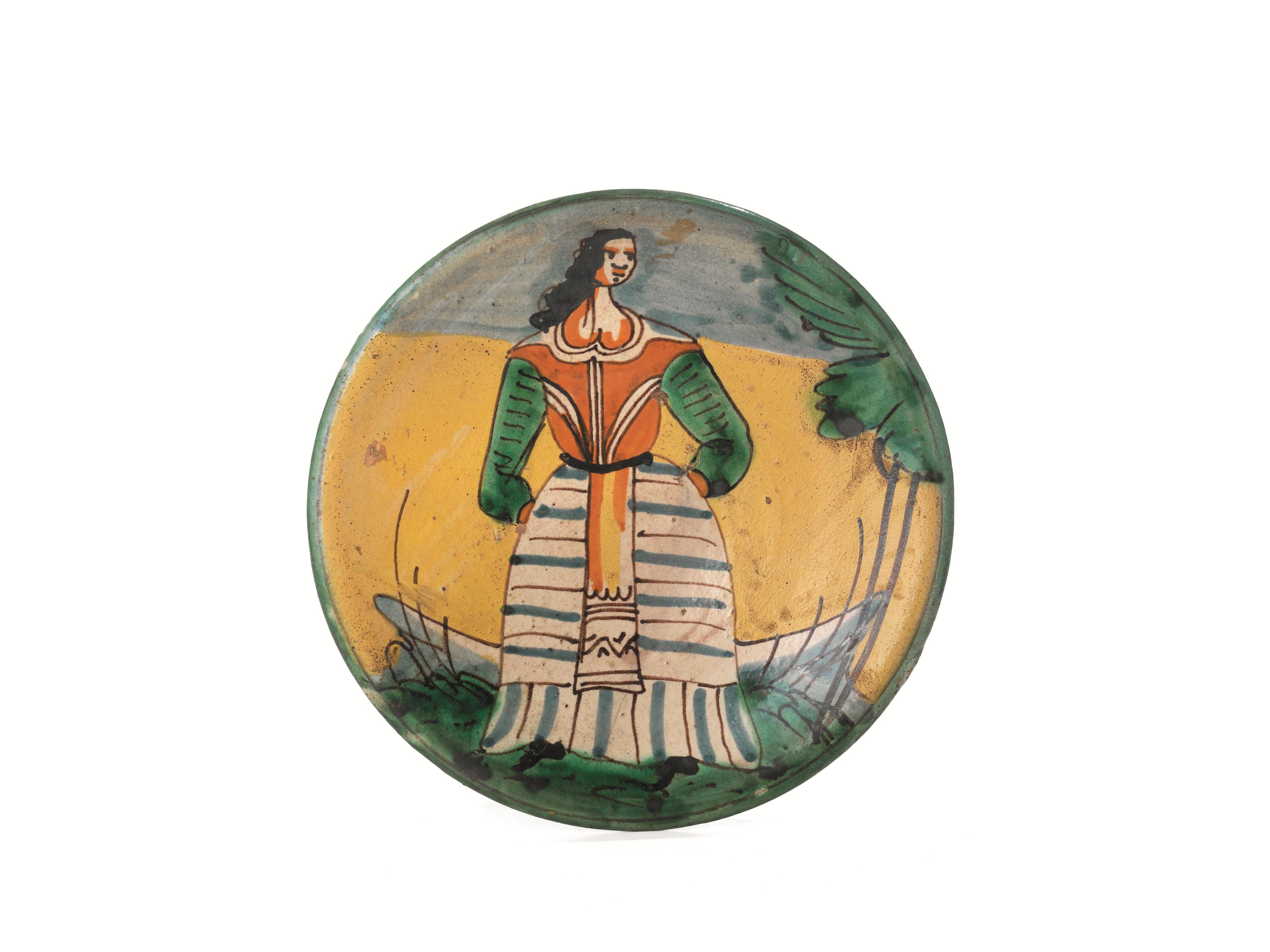 di maiolica, la forma svasata, con orlo arrotondato, poggia su un piede appena rilevato. decorata in giallo, giallo arancio, manganese nei toni del marrone e del nero, verde, azzurro. Il centro del cavetto mostra una figura femminile in piedi con un abito tradizionale con ampia gonna in un giardino con due siepi arrotondate. Sul retro etichetta iscritta "Rimbolti Firenze 1965", alt. cm 6, diam. cm 25