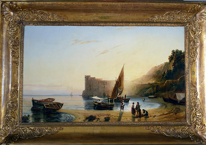 Smargiassi Gabriele (Vasto, CH 1798 - Napoli 1882) Palazzo Donn'Anna olio su tela, cm 40x67 firmato e datato in basso a destra: Smargiassi 1936
