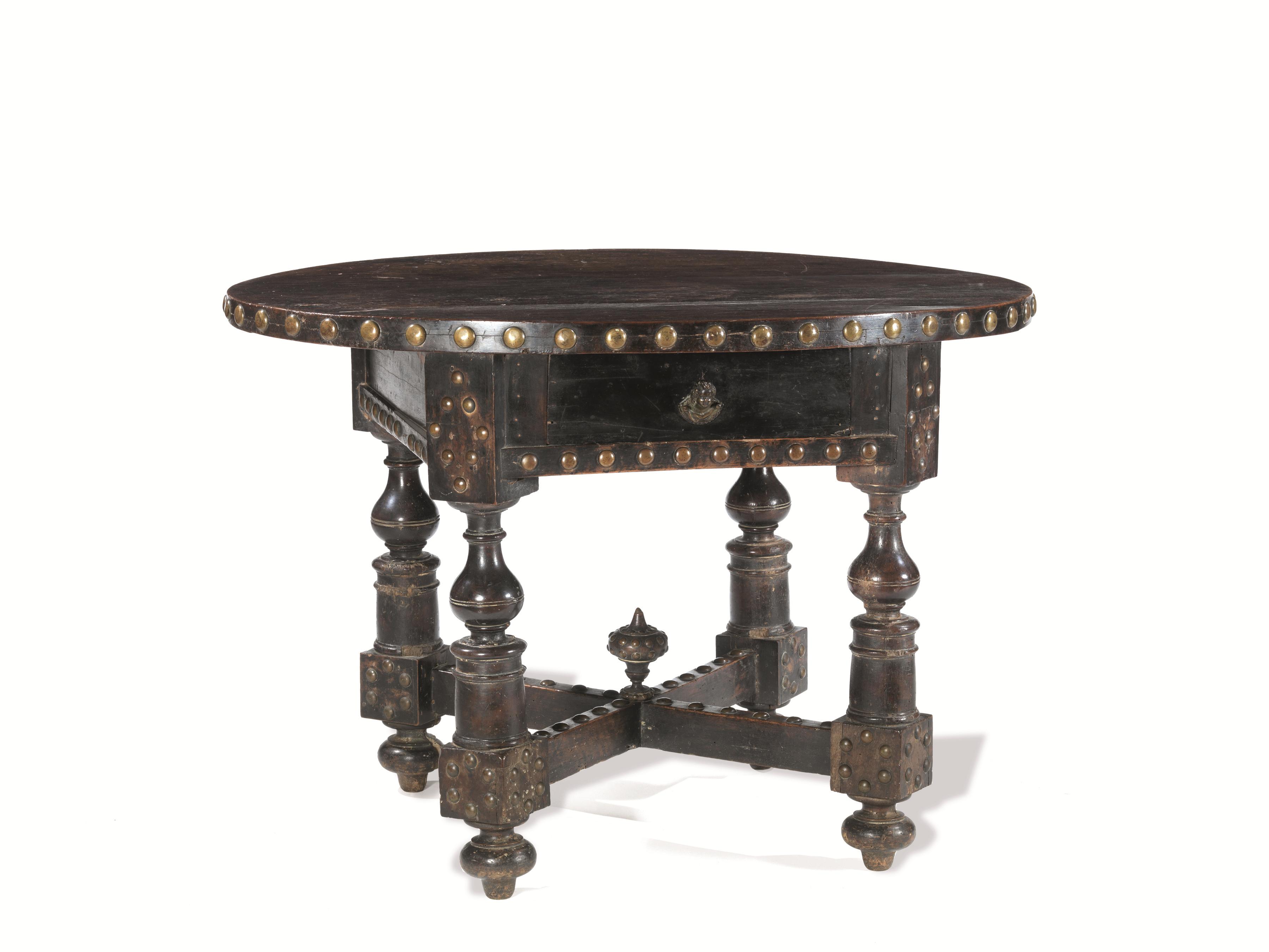 in noce a patina scura decorato da chiodi in bronzo, piano ovale, un cassetto nella fascia di epoca posteriore, gambe tornite a balaustro riunite da crocera centrata da vaso stilizzato, piedi a cipolla, cm 116x85x82, lievi danni e alcuni restauri