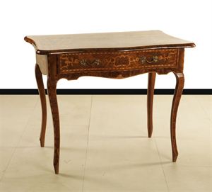 TAVOLO A MURO Tavolo a muro lastronato in noce con intarsi di legni di vaire essenze, Piemonte epoca XVIII secolo H 81 100x60 cm A wall table in walnut veneer wall with wood inlays of various woods, Piedmont eighteenth century