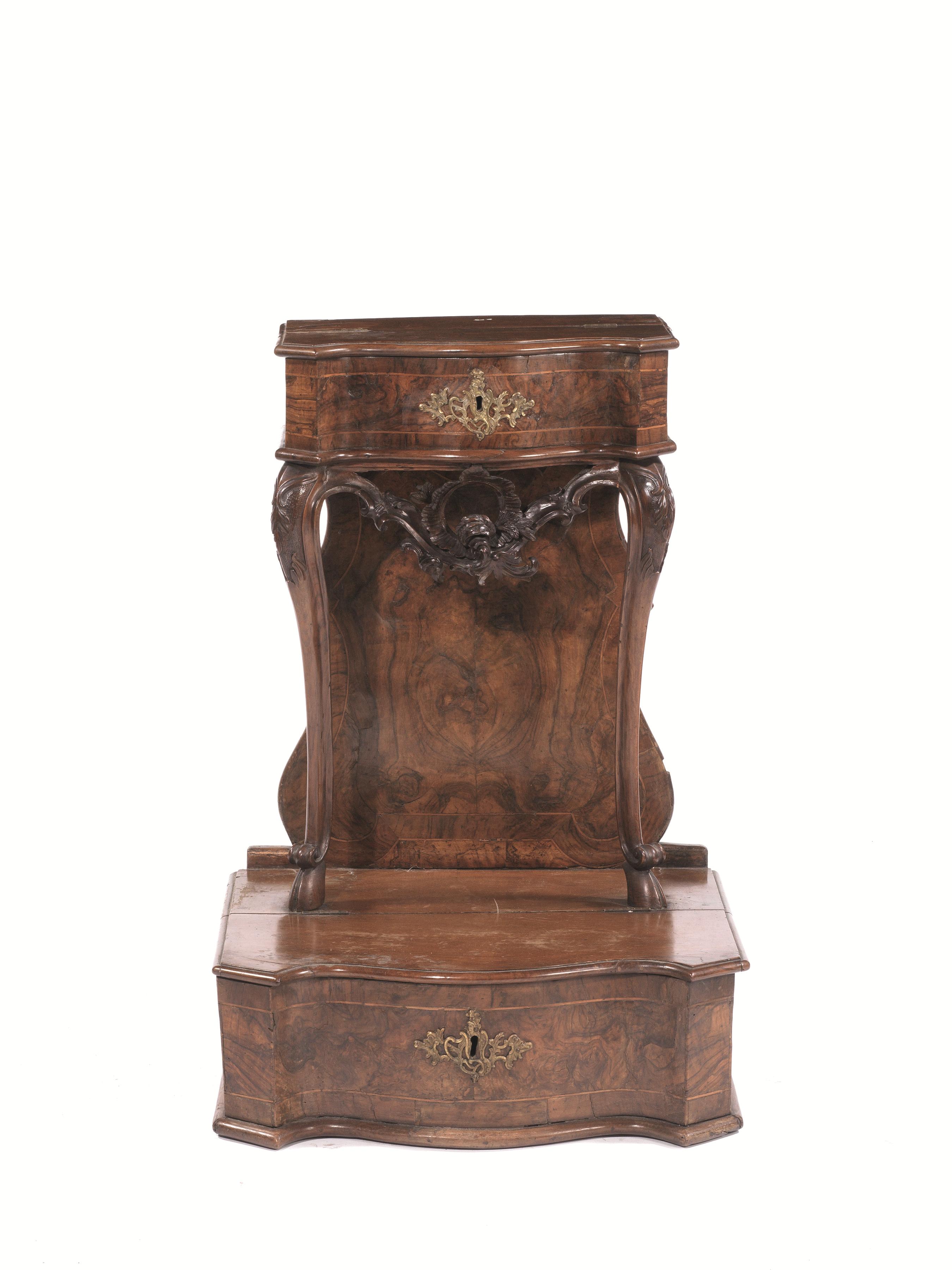 in radica di noce intagliata, piano sagomato, un cassetto nella fascia, pendaglina traforata e centrata da motivo rocaille, gambe sinuose desinenti in piedi a zoccolo stilizzato, basamento sagomato con cassetto, cm 47x49x89