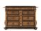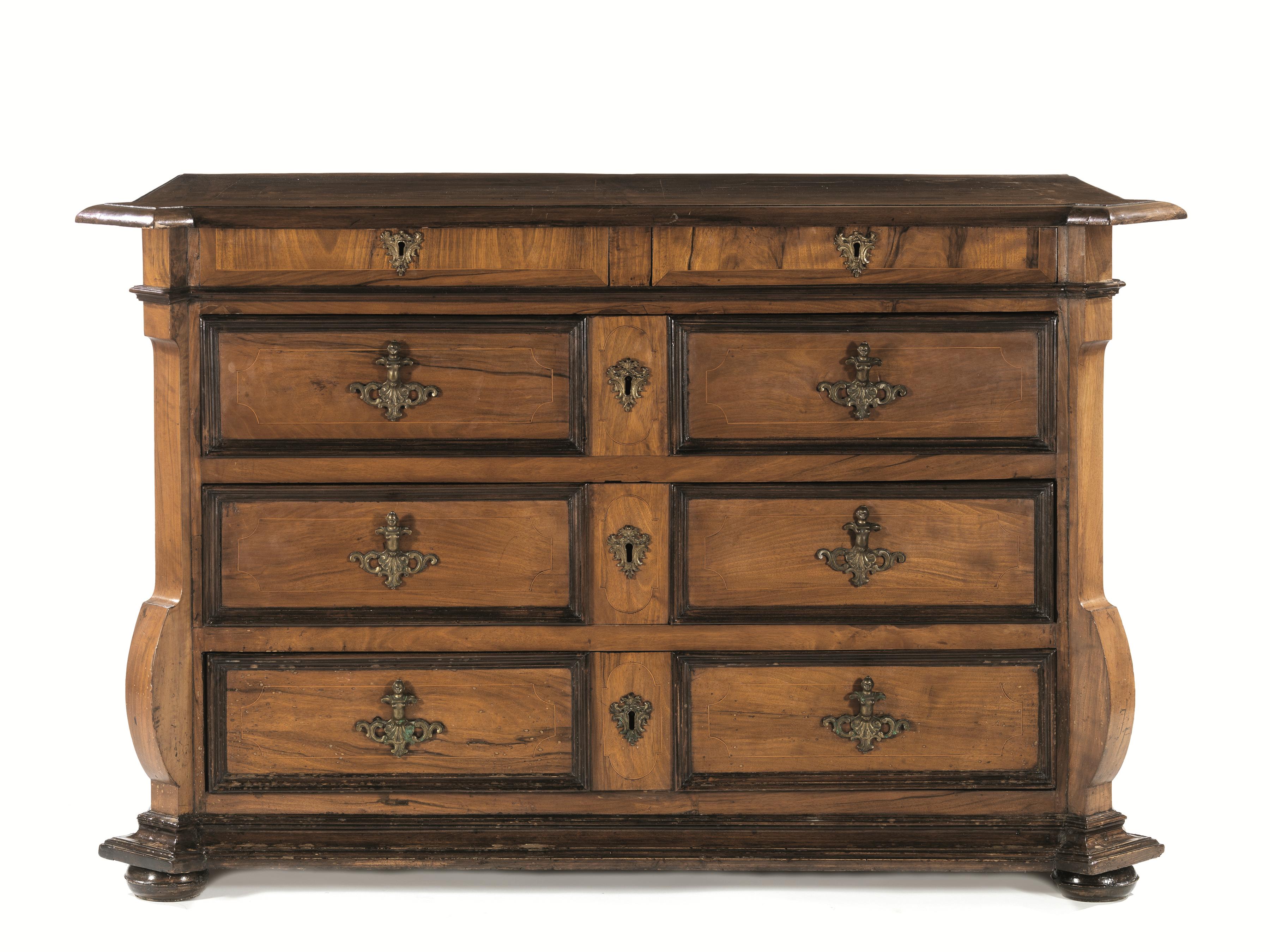 in noce a patina bionda, filettato in bosso e con profili ebanizzati, piano rettangolare con becco di civetta e angoli scantonati, due cassetti appaiati nella fascia e tre sottostanti inquadrati tra lesene in forma di mensole, base modanata, piedi a cipolla, cm 152x77x97