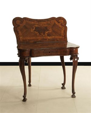 TAVOLO DA GIOCO Tavolo da gioco lastronato in noce con intarsi in legni di...