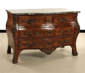 CASSETTONE Importante cassettone firmato J. Lapie, lastronato in legno di noce e finemente intarsiato, mosso sui fianchi e sul fronte, piano in marmo, Francia epoca Reggenza H 89 132x66 cm Important bureau signed J. Lapie, veneered in walnut and finely carved, moved on the sides and front, marble top, French Regency era