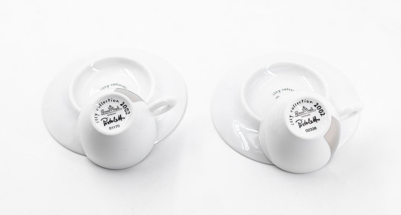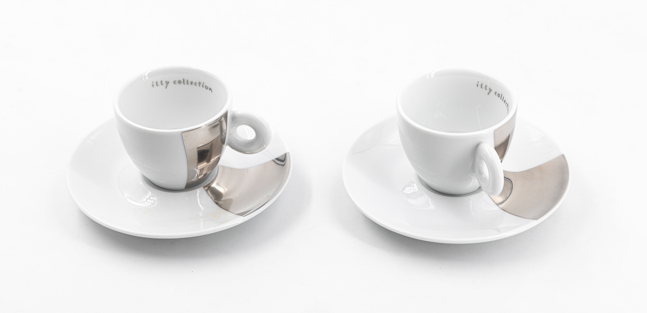Set composto da 2 piattini e 2 tazzine in ceramica serigrafata, edizione realizzata per la serie Art Collection di Illy