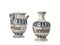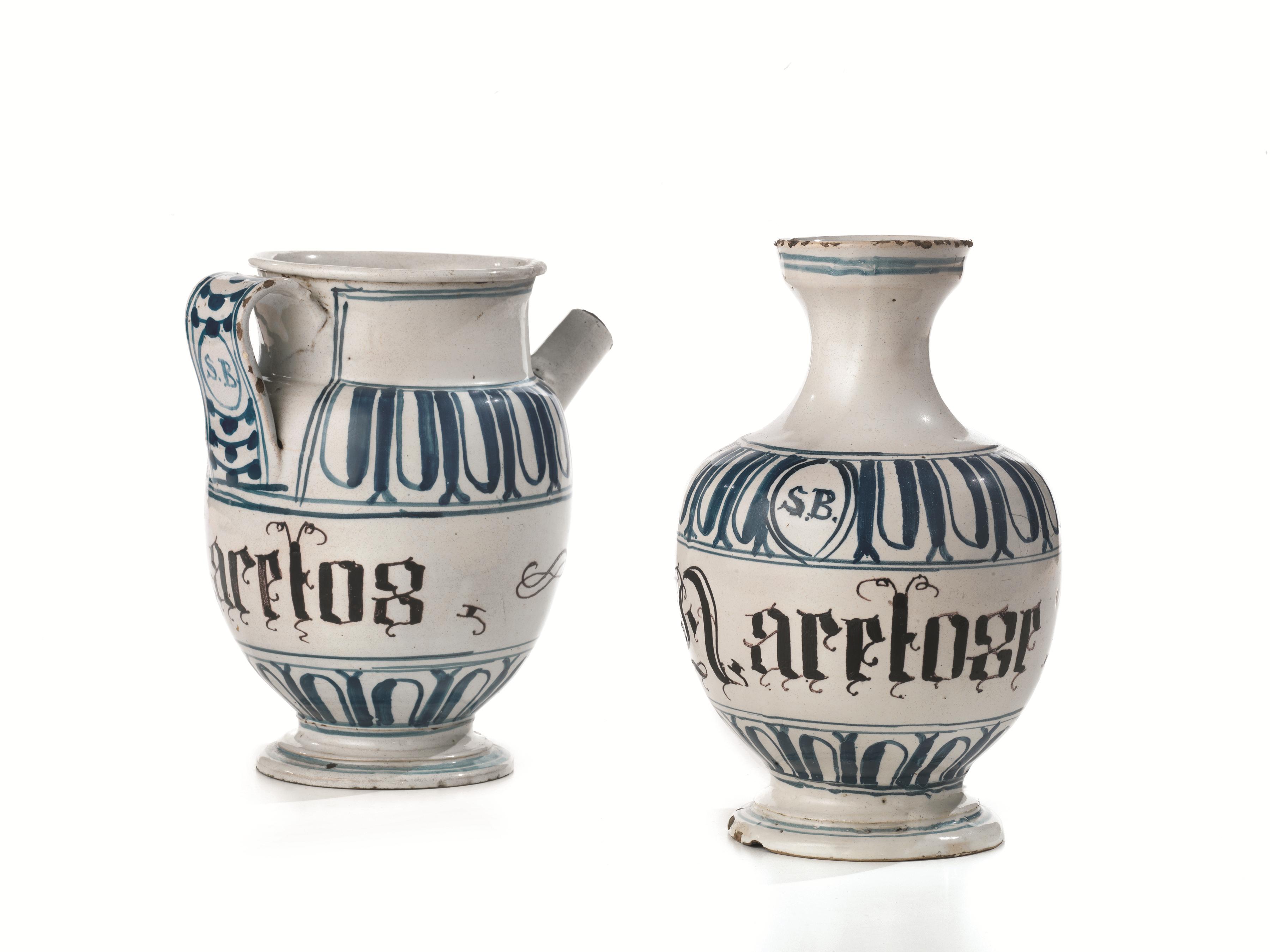 in maiolica; fiasca su basso piede piatto ed espanso, corpo ovoidale con alto collo cilindrico terminante in un’imboccatura larga con orlo piano tagliato a stecca; orciolo di forma globulare su basso piede piano ed espanso, alto collo cilindrico con bocca ampia dall’orlo estroflesso con ansa a nastro e beccuccio a cannello cilindrico. Il decoro, realizzato in monocromia blu. imita la forma delle baccellature, mentre sul fronte un medaglione racchiude la sigla S.B. probabilmente riferita alla proprietà della farmacia. Al centro dei contenitori corre un cartiglio con scritta apotecaria, in bruno di manganese, delineata in caratteri gotici, alt. cm 23 e cm 22 rispettivamente (2)