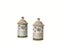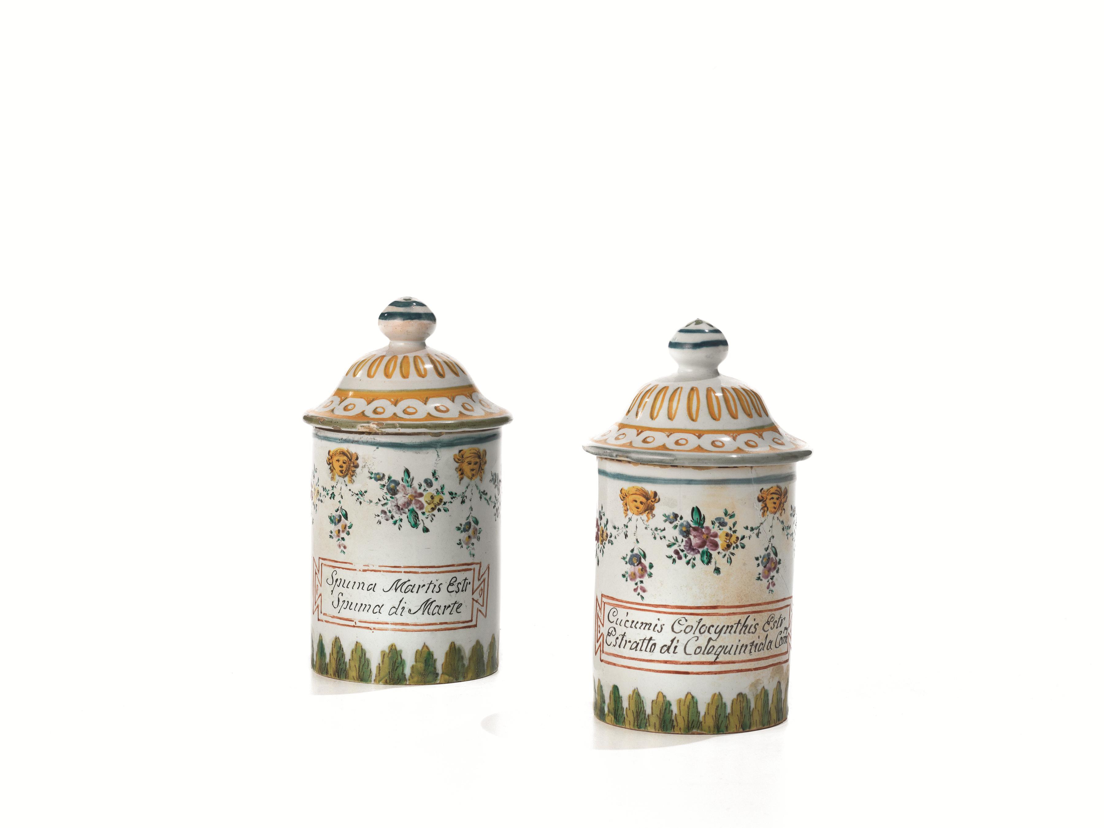 in maiolica, corpo cilindrico, completi di coperchio a calotta con terminale a pomolo. Il decoro presenta un sottile motivo a festone floreale trattenuto da mascheroni, che corre al di sopra del cartiglio con iscrizioni apotecarie in latino e in italiano; base decorata da un motivo a foglie lanceolate, coperchi dipinti in monocromia in giallo; marcati D sotto la base, alt. cm 16 (2)