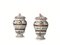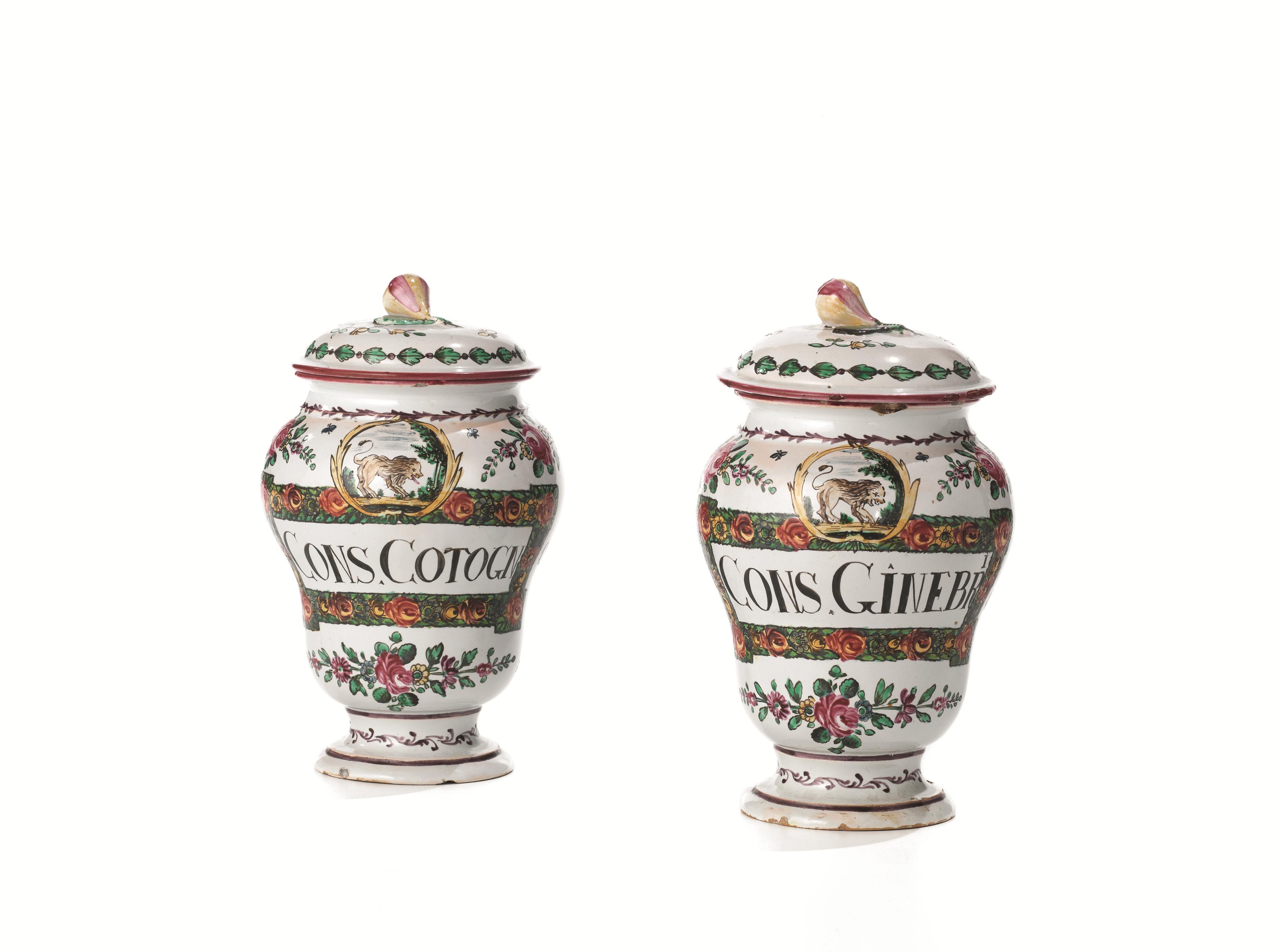 in maiolica, corpo a balaustro decorato con motivo “alla rosa” su piede alto e svasato, completi di coperchio con terminale a frutto. Il cartiglio farmaceutico al centro del vaso è delineato in bruno di manganese in caratteri capitali ed è sovrastato dal simbolo della spezieria committente: un medaglione con leone, alt. cm 20 (2)