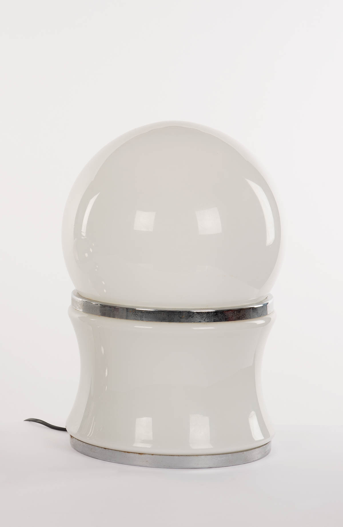 Goffredo Reggiani Lampada da tavolo;In vetro opalino e metallo cromato, h. 43...