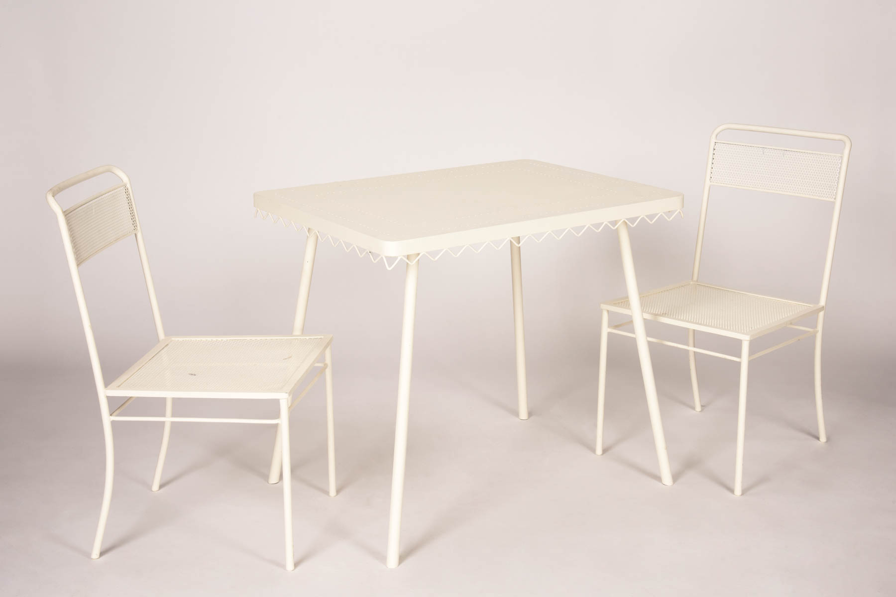 Italienische Manufaktur/Manifattura italiana Tavolo da giardino con 2 sedie Hotel Bristol Merano, 1953/1954;Ferro laccato color bianco, tavolo H. 80 x 60 cm, riverniciato