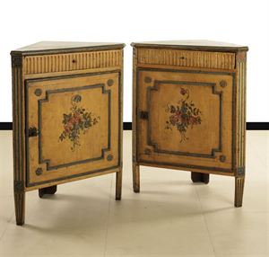 COPPIA DI CANTONALI Coppia di cantonali in legno laccato e decorato, Piemonte fine XVIII secolo H 92 prof 69 cm Pair of cantonal lacquered wood and decorated, late eighteenth-century Piedmont