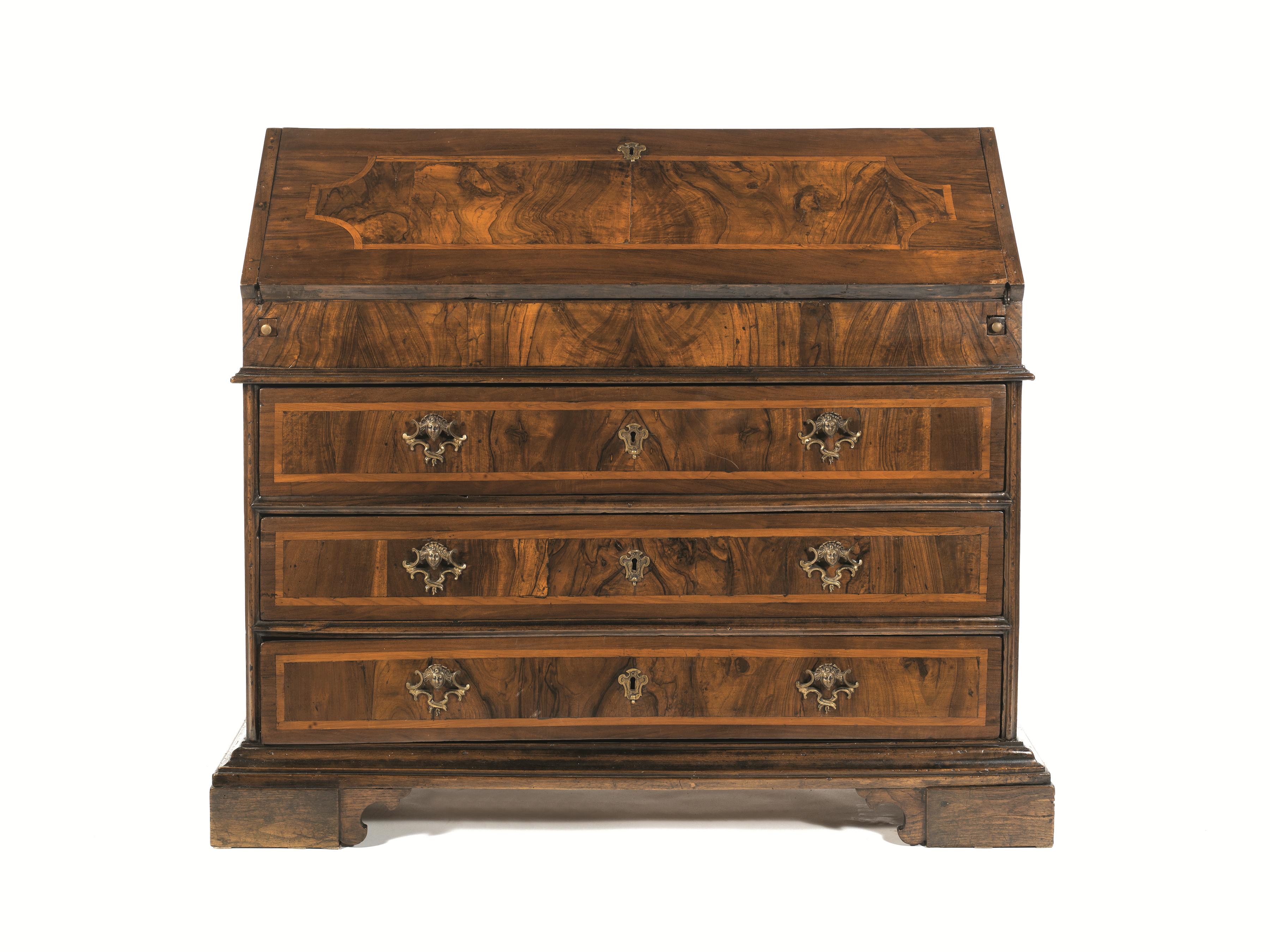 in noce e radica di olivo intarsiato, sportello a ribalta, scarabattolo interno con sei cassetti e segreto, tre cassetti sottostanti, base modanata, piedi a mensola, cm 126x59x115, restauri al basamento