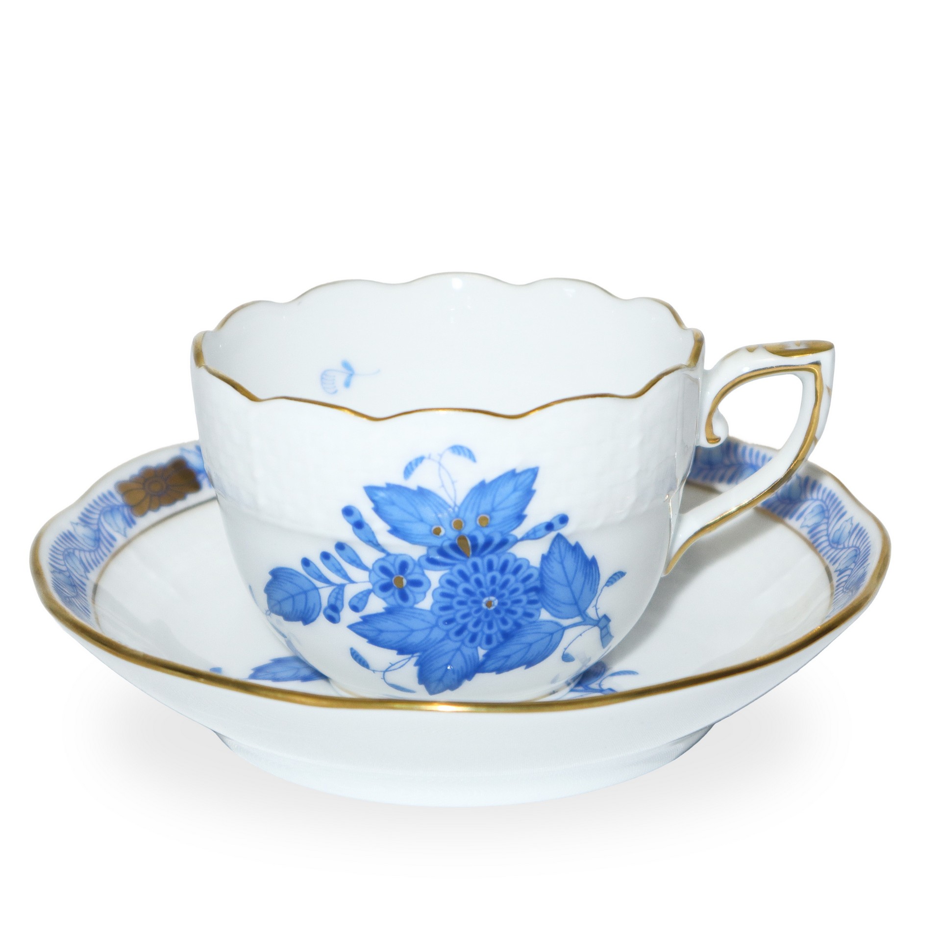 Herend Hungary (Herend 1826) - Completo Servizio di piatti decoro "Apponyi blue" in porcellana blu su fondo bianco, bordo Ozier e profilo dorato Composto da 104 pezzi: 12 Sottopiatti, 24 piatti piani, 12 piatti fondi, 24 piatti da frutta, una insalatiera, 1 piatti ovale da portata, 1 piatto da portata circolare, 2 piatti foglia da portata, 1 caffettiera, 1 zucchiera, 1 lattiera, 12 tazze da caffè con piattino, 12 tazza da tè con piattino,