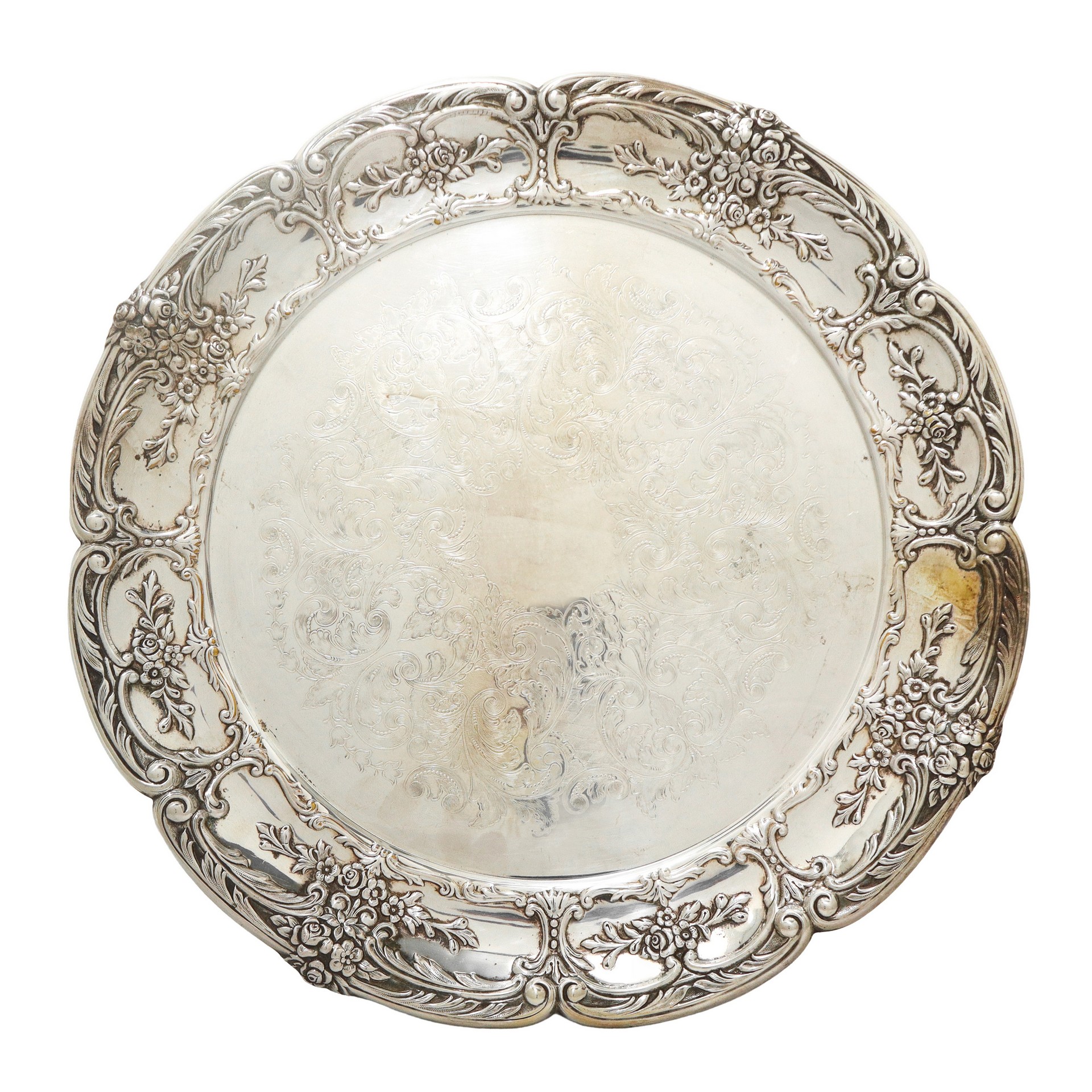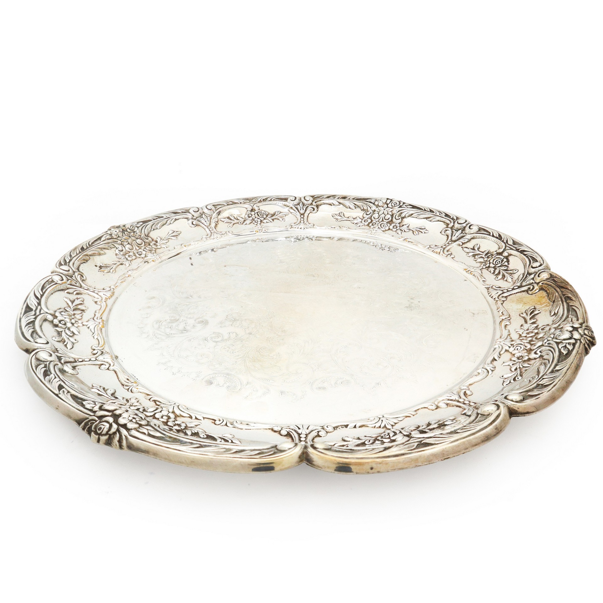 Vassoio in sheffield bulinato e sbalzato a foglie cm 36 Presente incisione con nome precedente proprietario