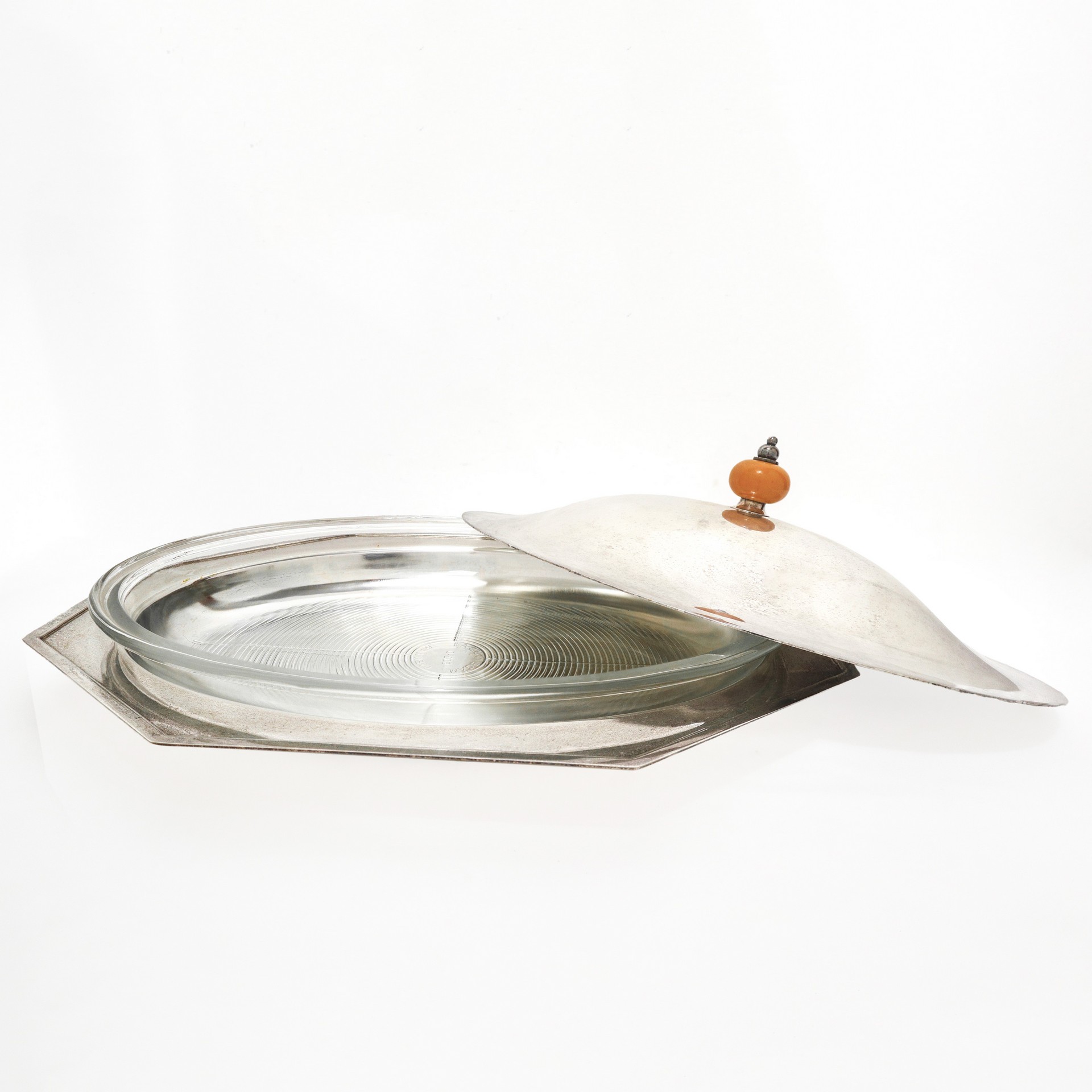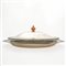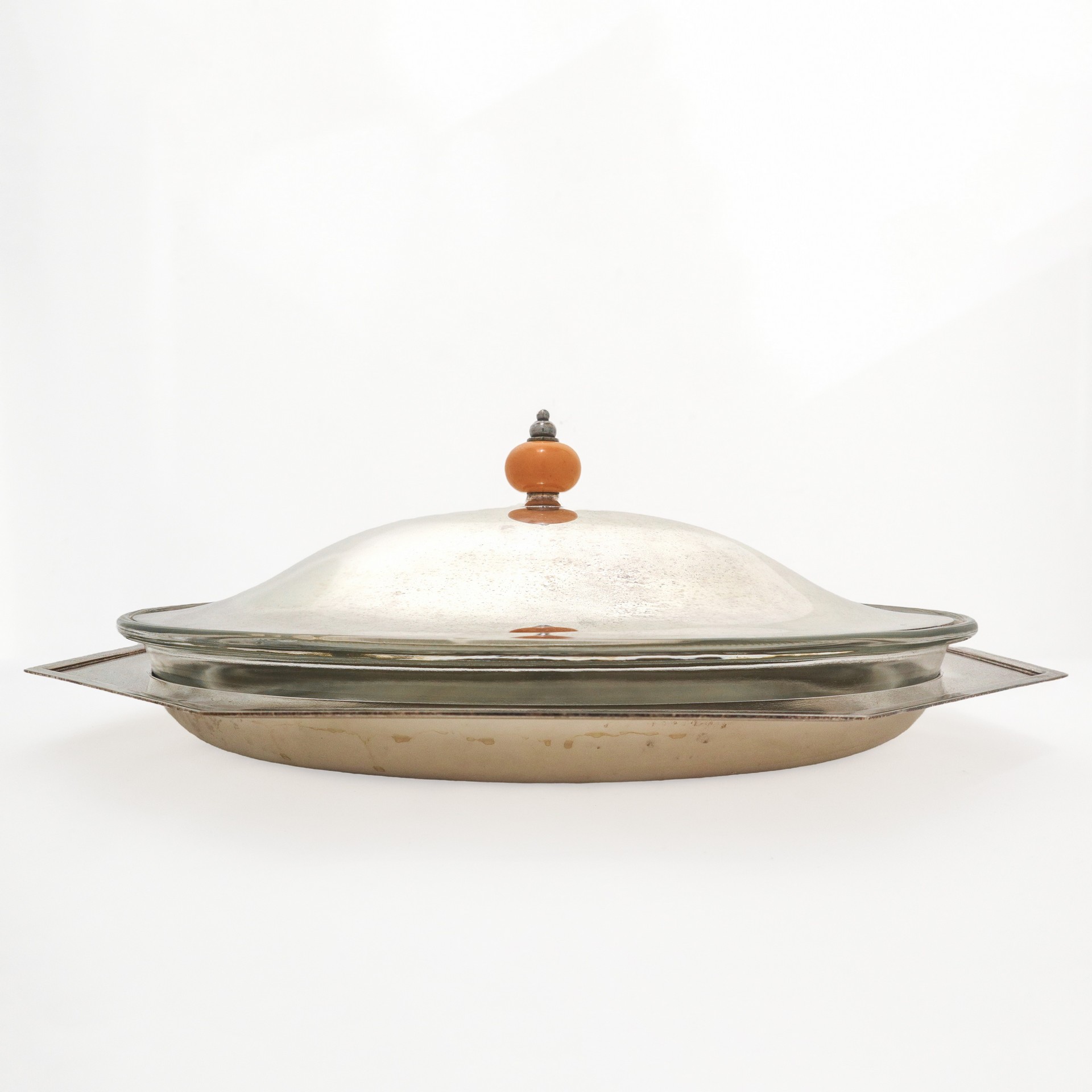 Pirofila ovale in sheffield con pyrex all'interno e presa gialla sul coperchio h cm 5X40