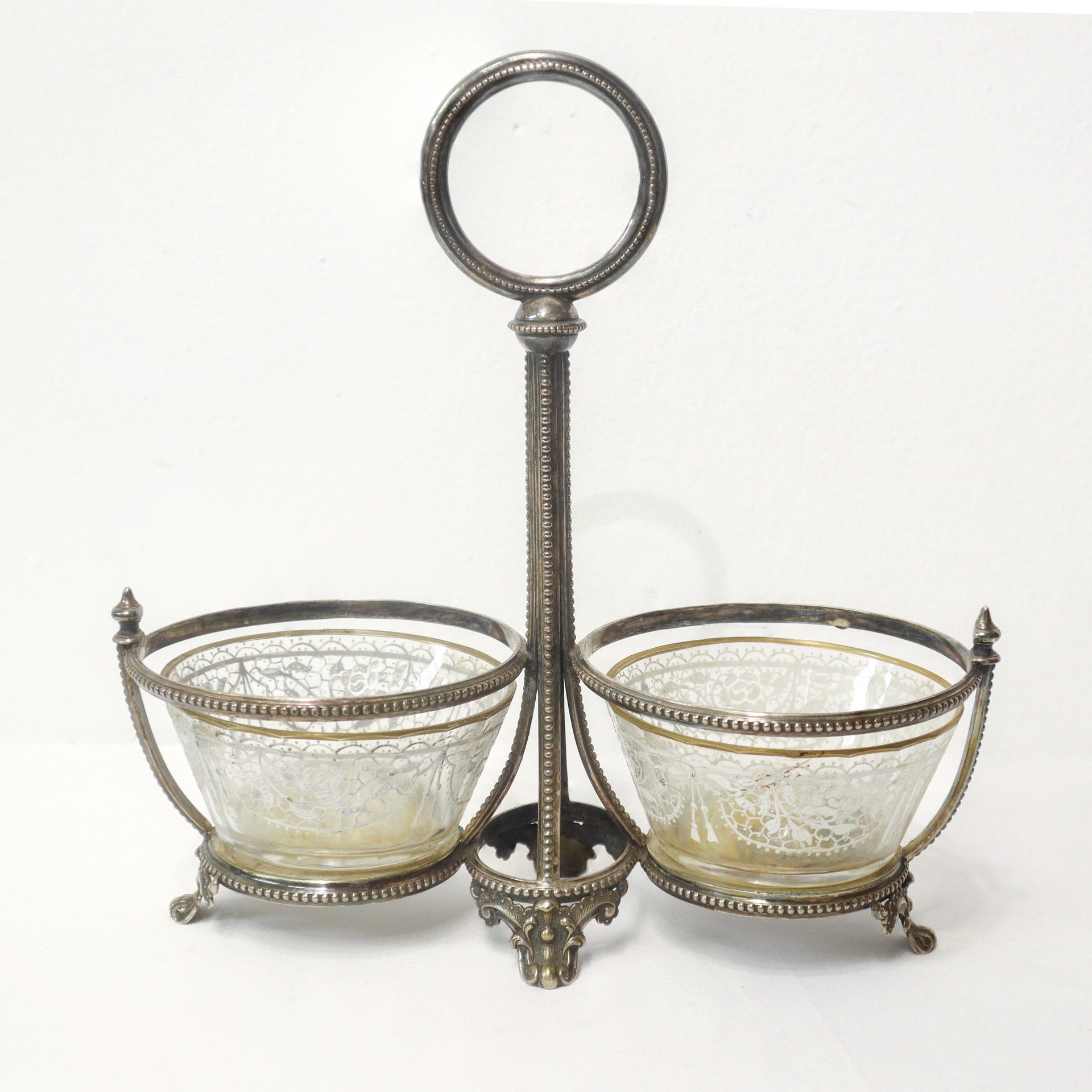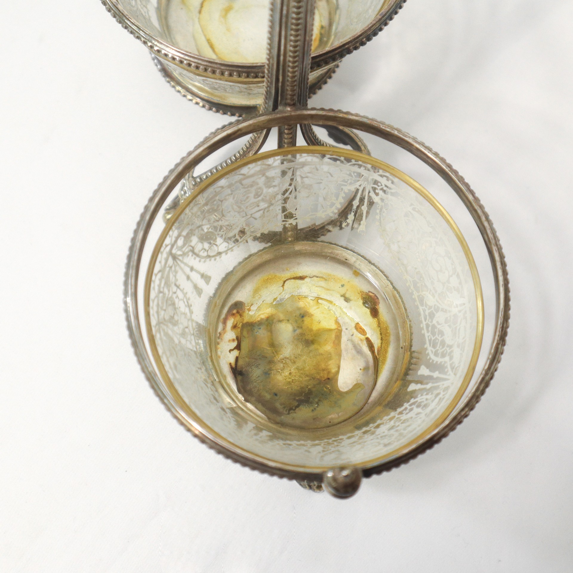 Salsiera in silver e vetro decorato h cm 24,5 iscrizione sul fondo G.R.COLLIG 130 REGENT ST.LONDON