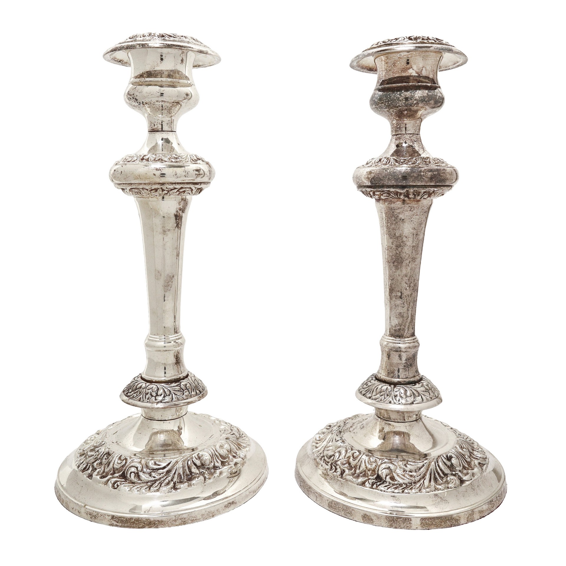 Coppia di candelabri monoforo in sheffield con lavorazione a ramage