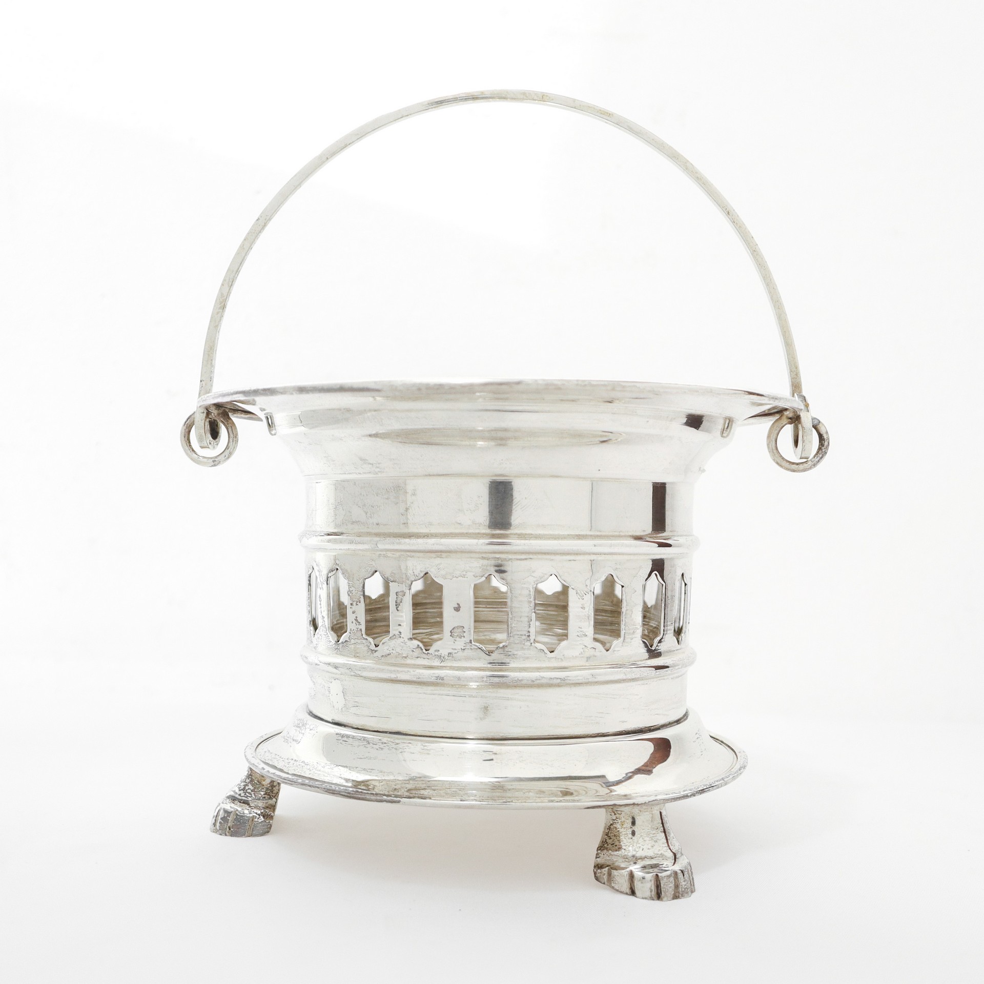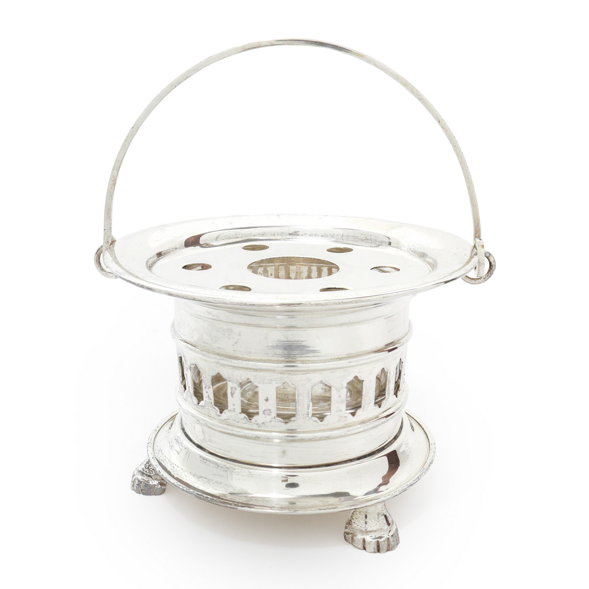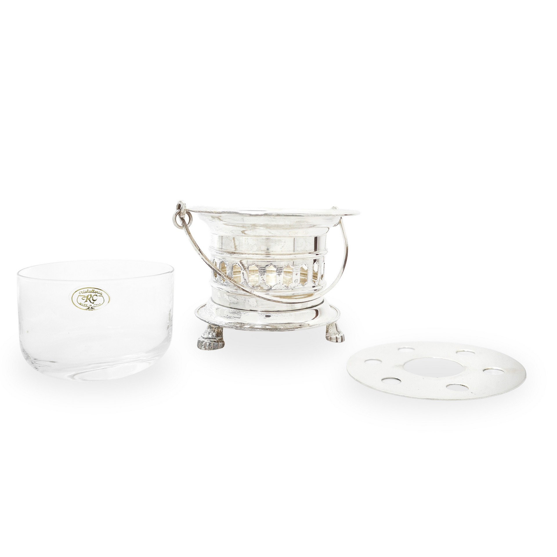 Fioriera a cestino in metallo argentato con portafiori in vetro