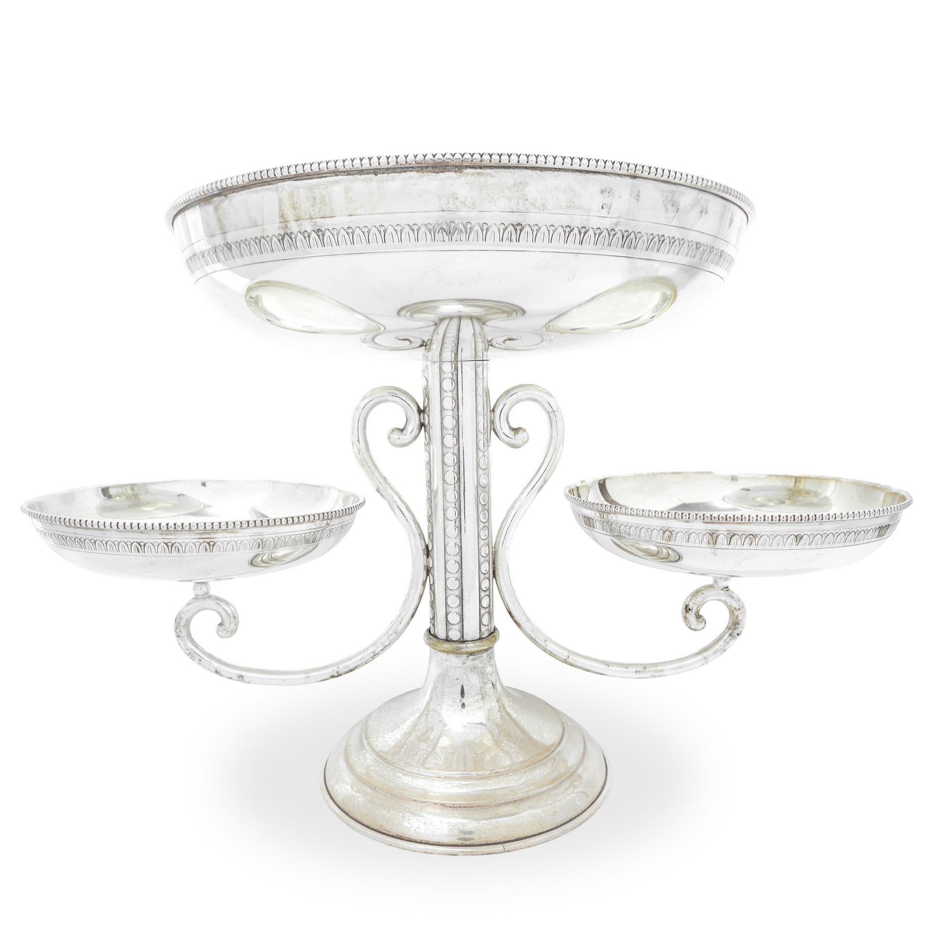Alzatina con tre piatti in metallo argentato
