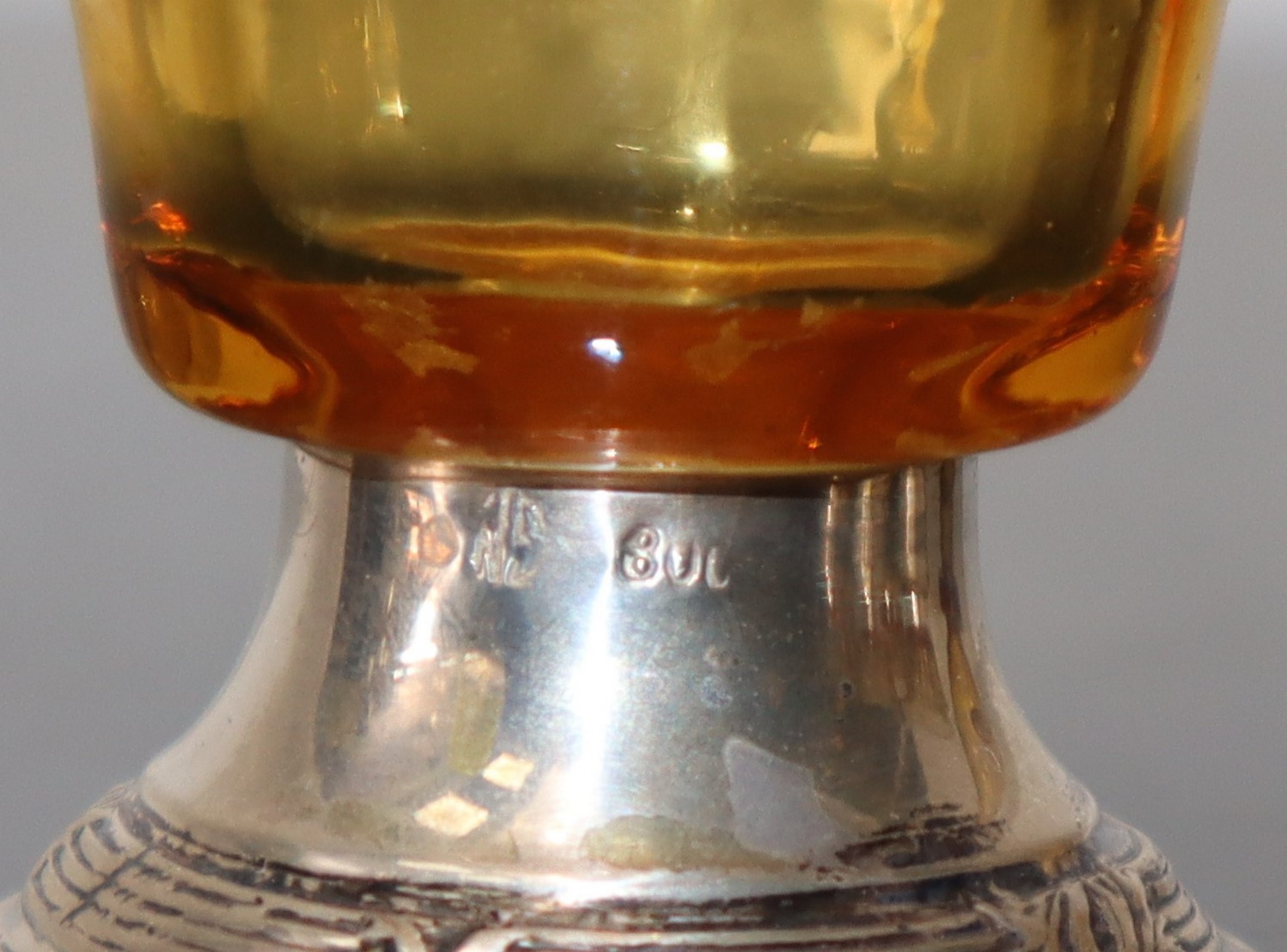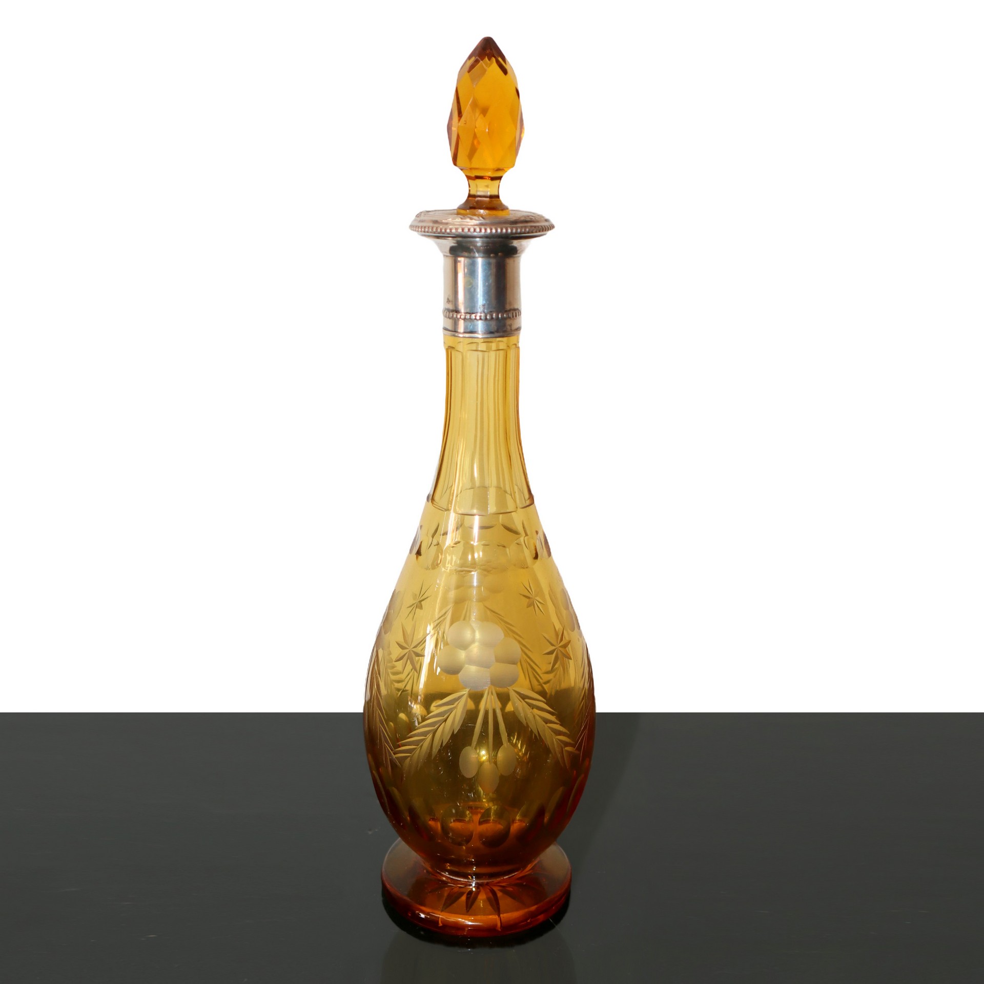 Servizio da liquore in vetro nei toni del pagliesco ed argento 800 Composto da bottiglia e 12 bicchierini