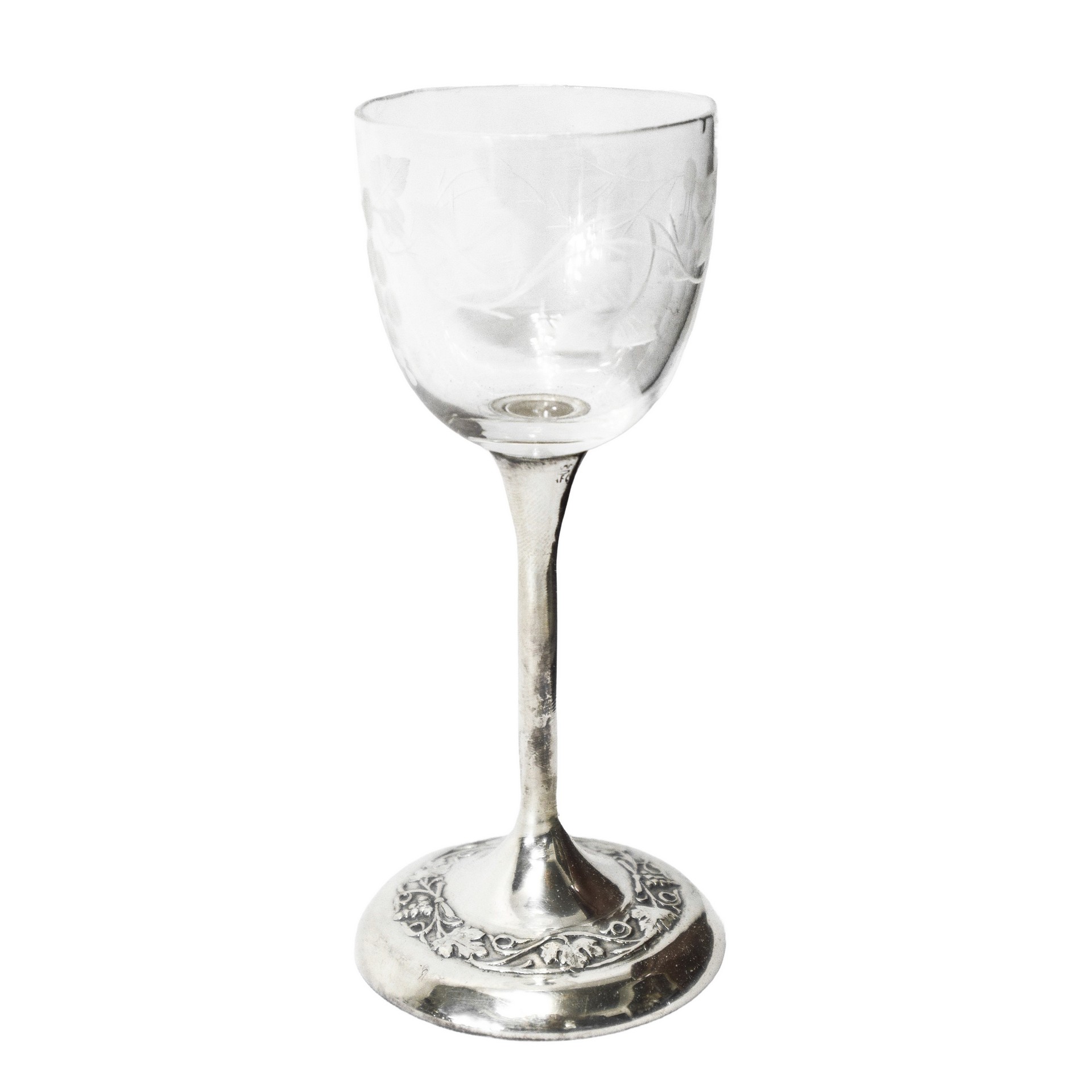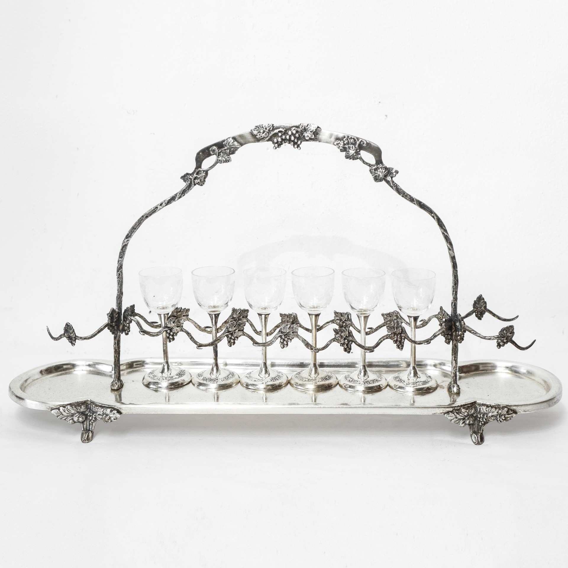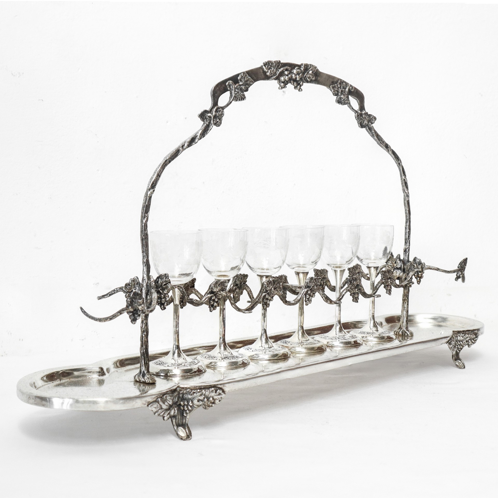 Set da rosolio con bicchierini in vetro molato e intagliato a tralci di vite e stelo in sheffield con vassoio sbalzato con motivi di tralci di vite misura bicchieri: h cm 10 vassoio h cm 25X46