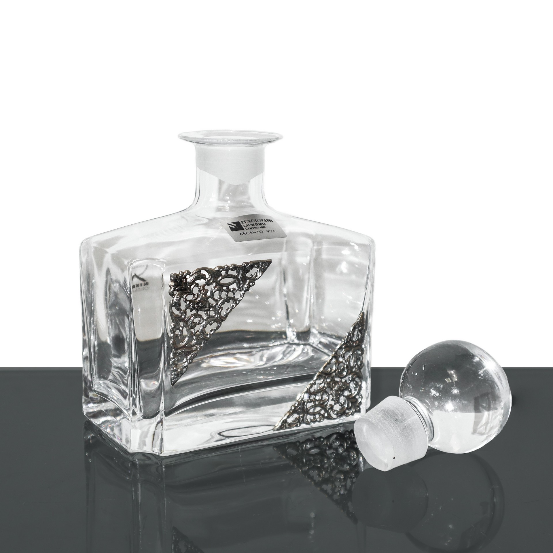 Bottiglia in cristallo con applicazioni in argento 925