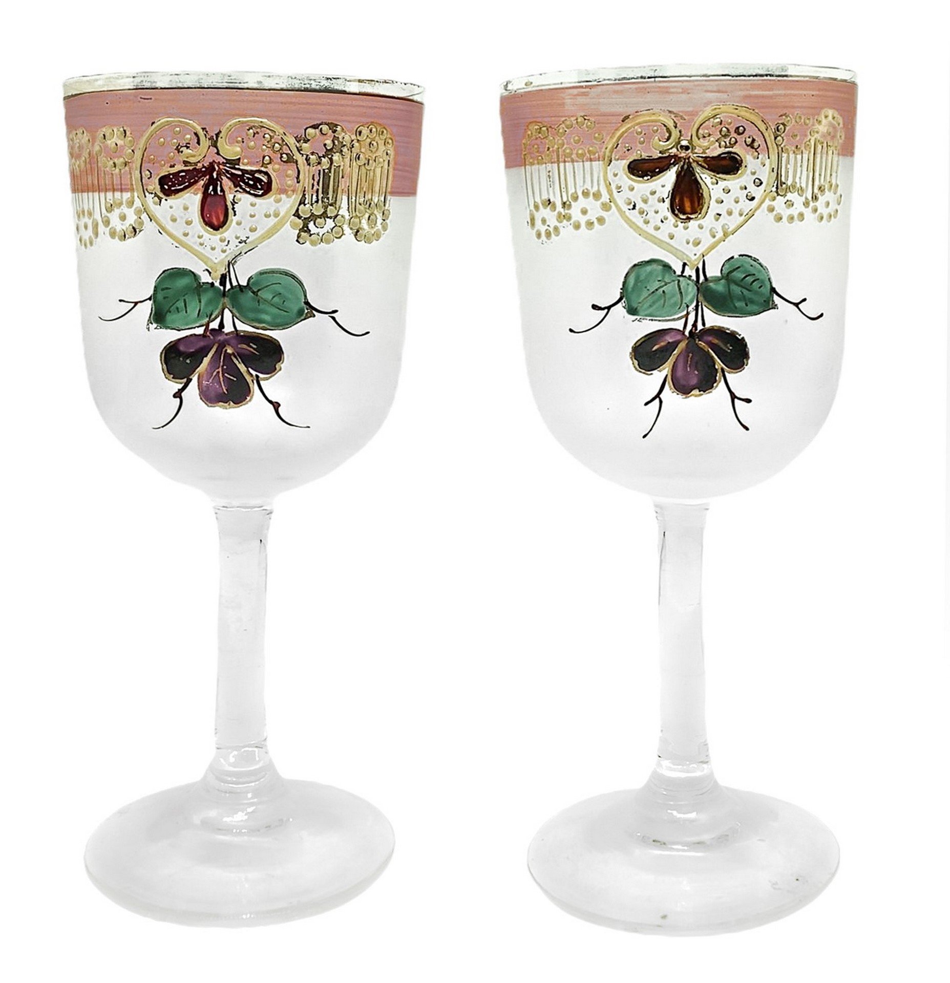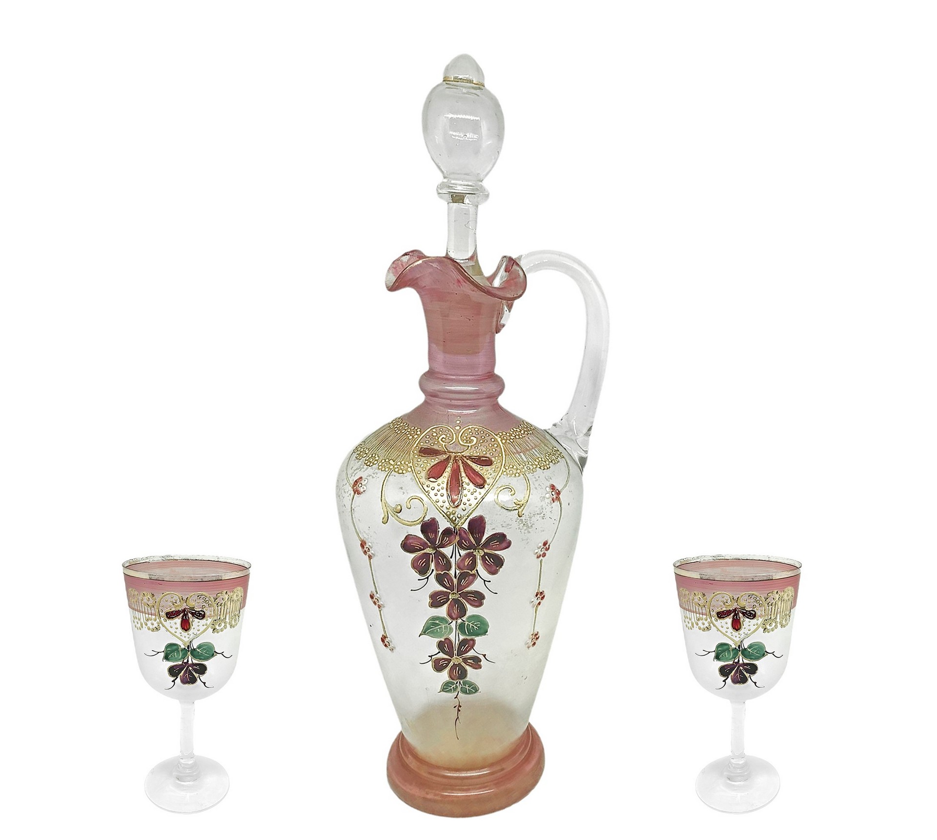Servizio da rosolio Composto da: 2 bicchieri e 1 bottiglia con decori di fiori in oro