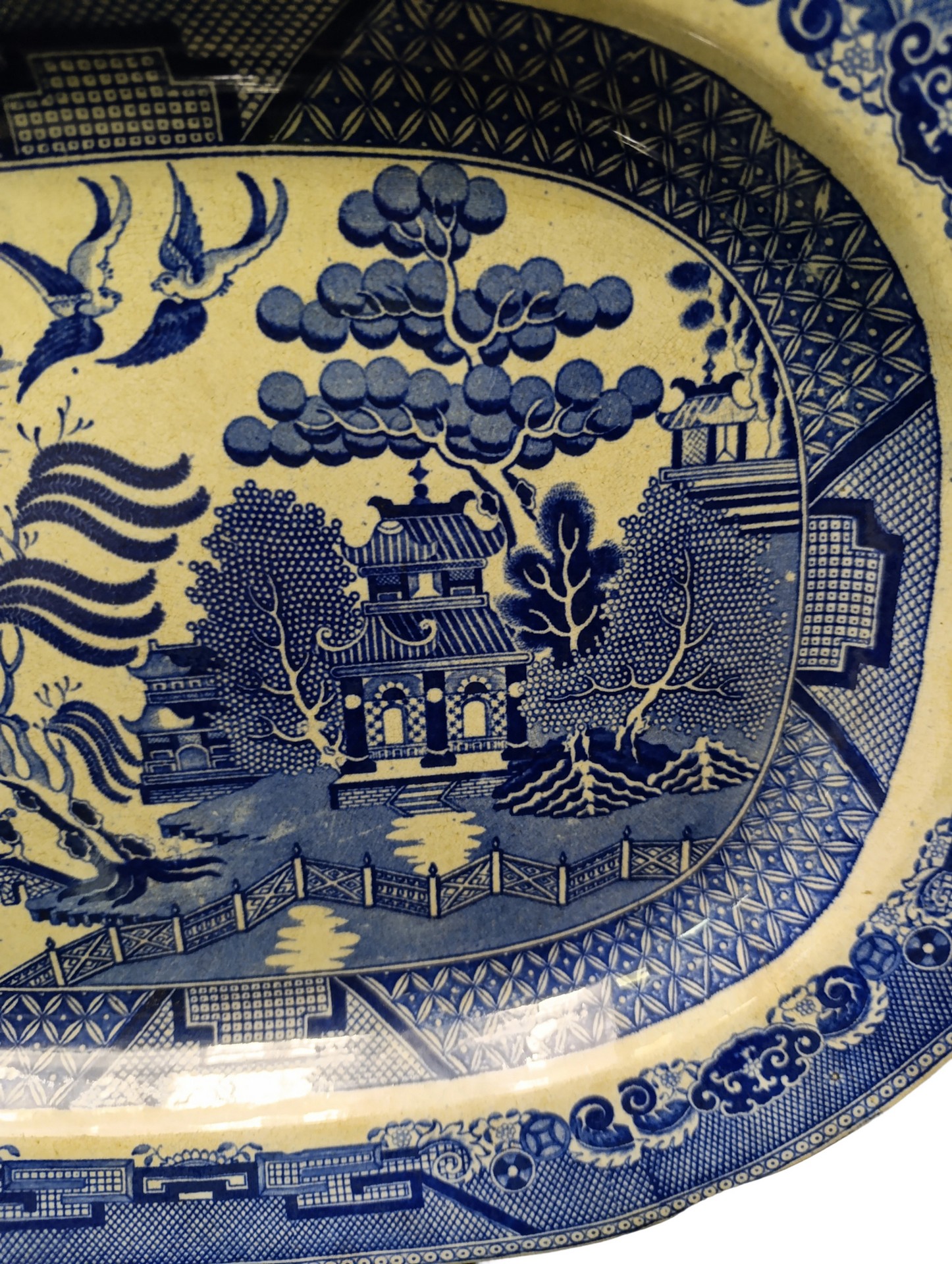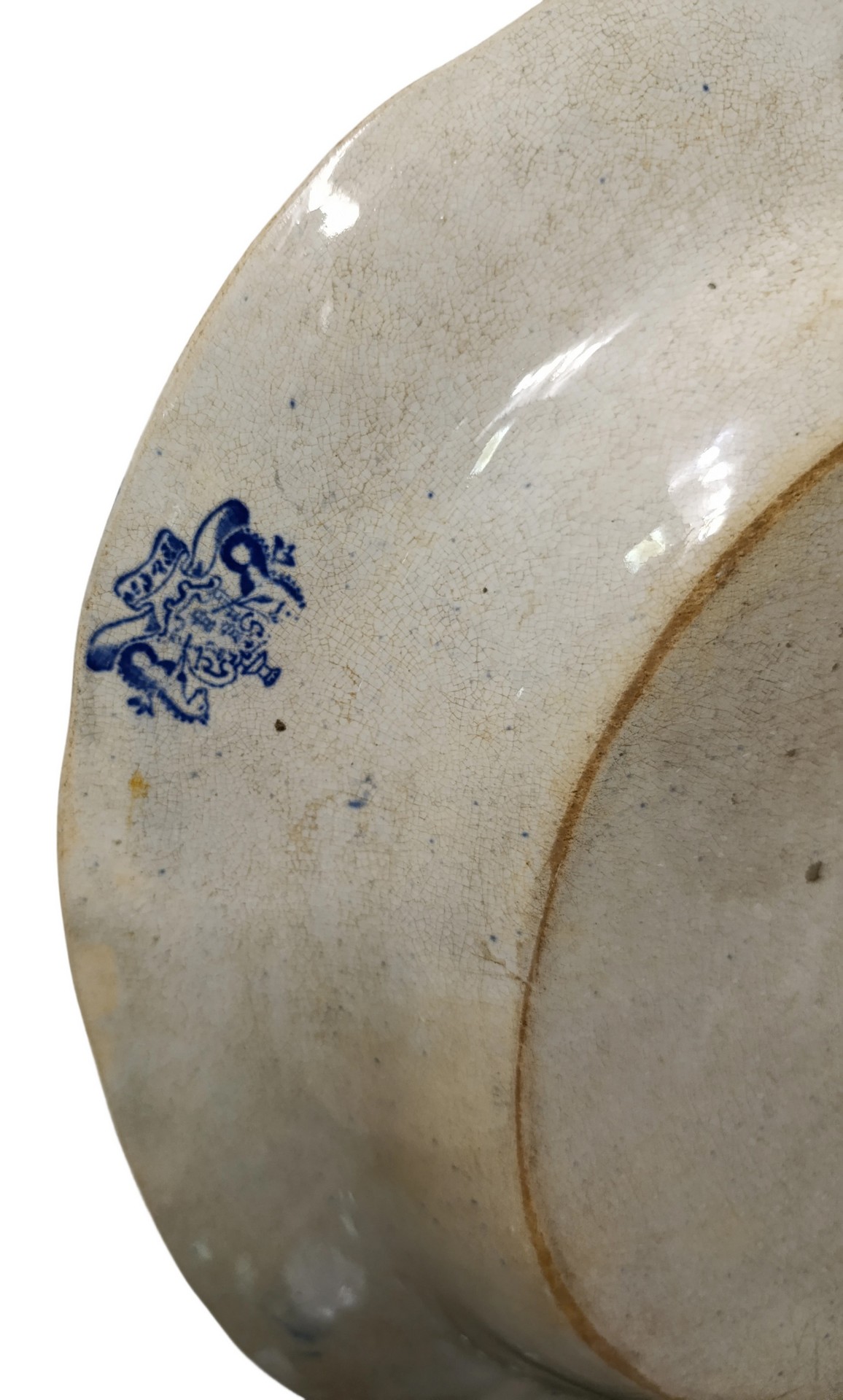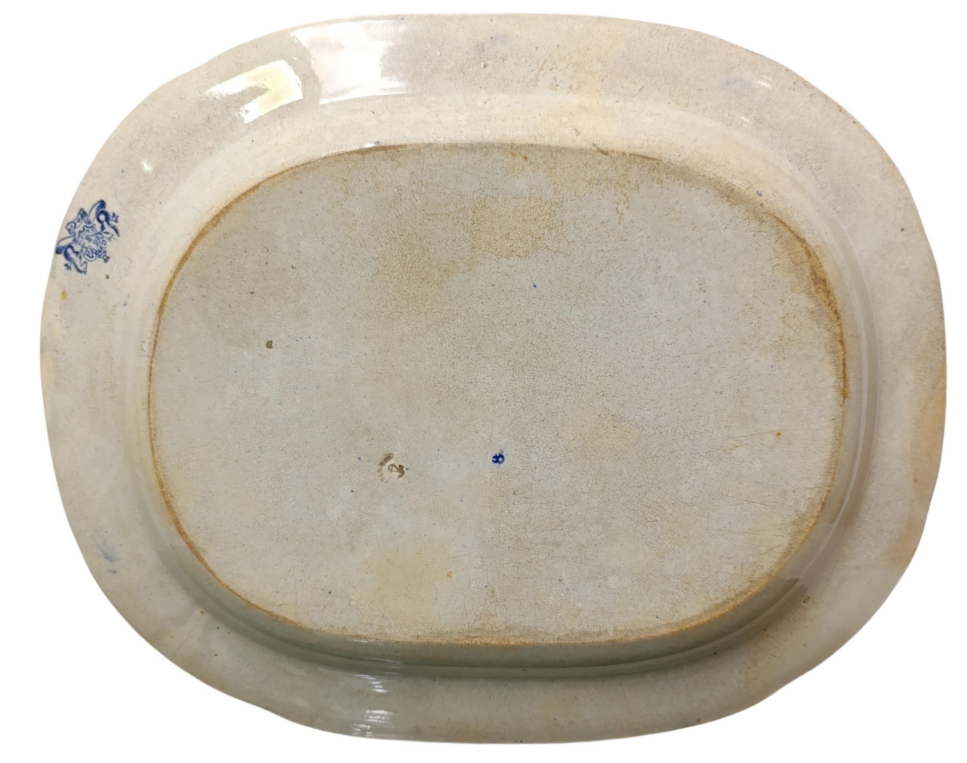 Piatto raffigurante paesaggio nei toni blu cm 45 x 36,5 Provenienza Inghilterra, recante marchio sul retro. Presenta una filatura sul lato inferiore.