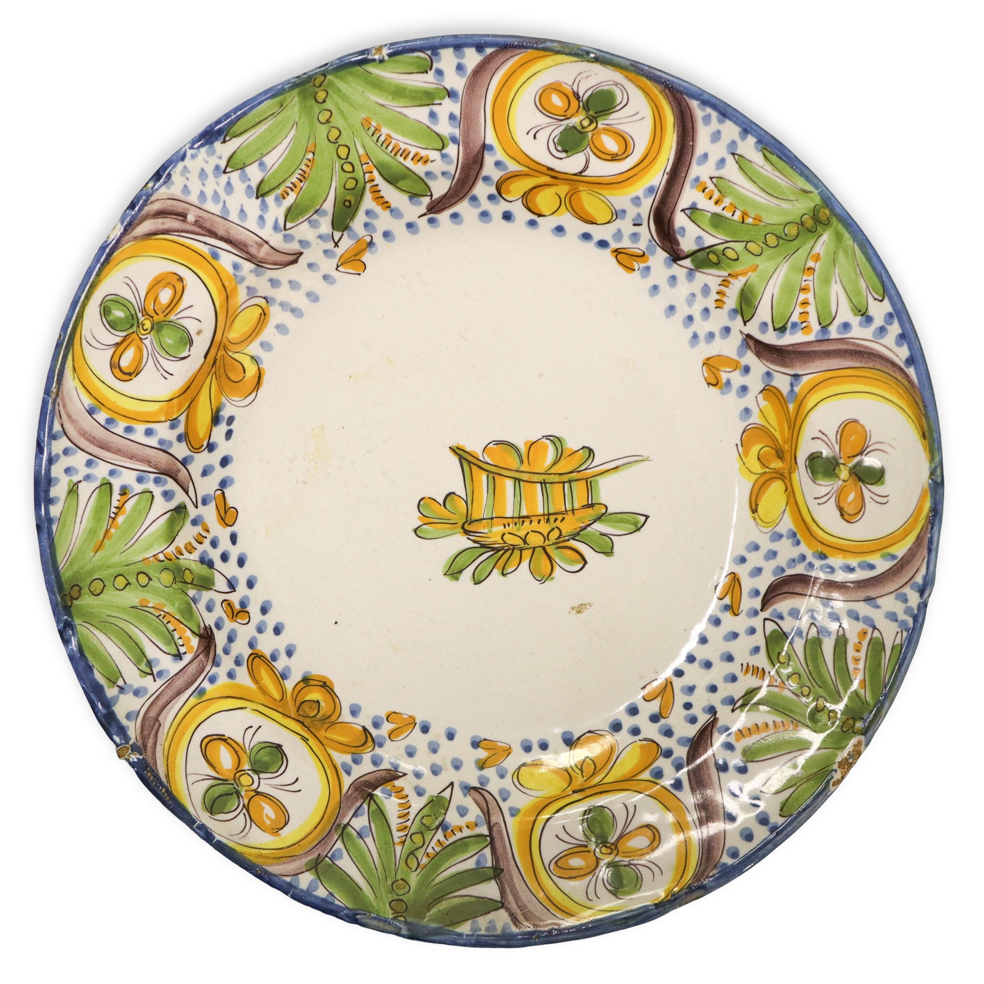 Piatto in ceramica valenciana dipinto policromo lungo il bordo con decoro centrale