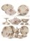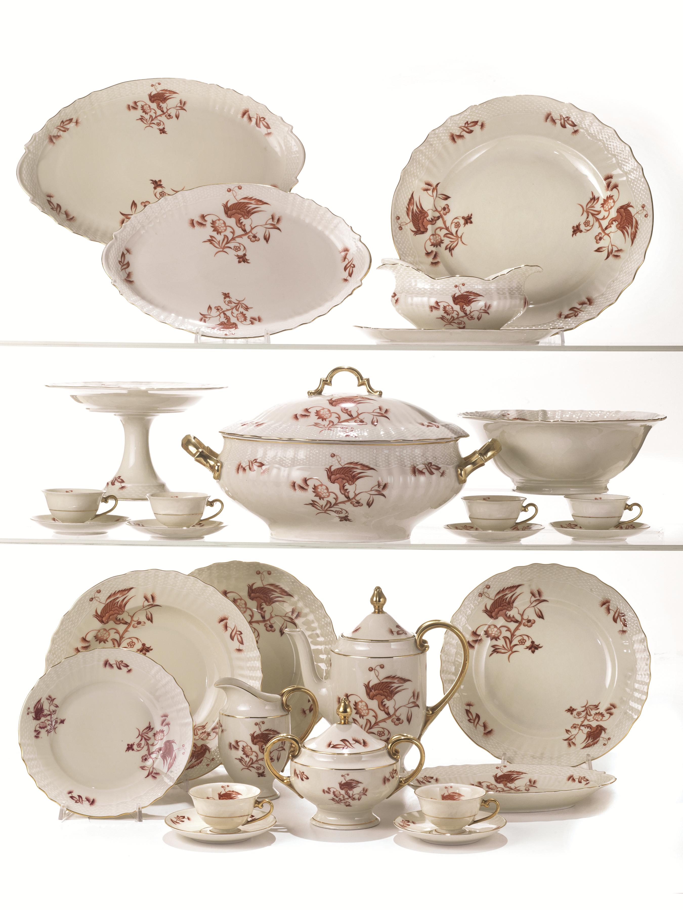 Composizione: 1 zuppiera, 1 salsiera con ramaiolo, 1 vassoio tondo, 3 vassoi ovali, 1 raviera, 1 insalatiera, 2 alzate, 12 piati fondi, 34 piatti piani, 12 piatti da frutta, 1 caffettiera, 1 lattiera, 1 zuccheriera, 11 tazzine e 11 piattini