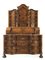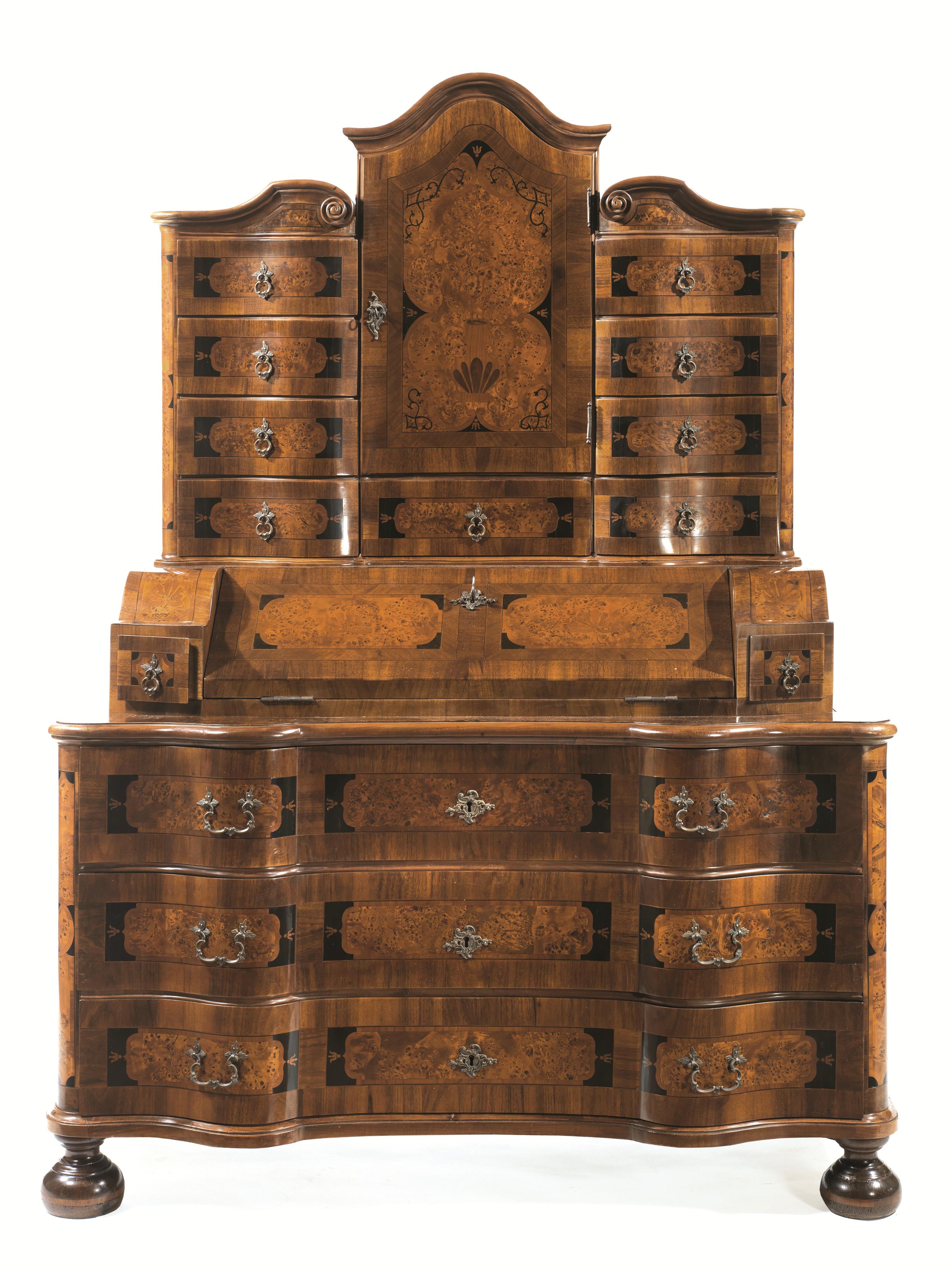 in noce intarsiato in radica di tuja ed altre essenze ebanizzate, corpo superiore a prospetto architettonico con cimasa sagomata tra volute, uno sportello centrale e nove cassetti con meccanismo segreto di chiusura, piano da aprirsi a ribalta fra due piccoli cassetti, scarabattolo interno con otto cassettini e vani segreti, parte inferiore con piano sagomato e fronte mosso a tre cassetti, piedi a boccia, cm 140x66x194